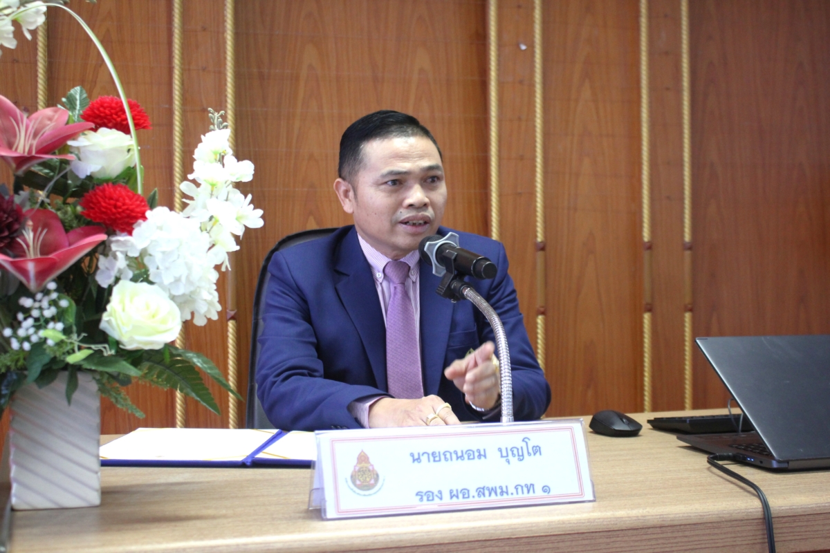 รองผู้อำนวยการสำนักงานเขตพื้นที่การศึกษามัธยมศึกษากรุงเทพเทพมหานคร เขต 1 เป็นผู้กล่าวรายงาน ณ ห้องประชุมราชพฤกษ์ ชั้น 5 สำนักงานเขตพื้นที่การศึกษามัธยมศึกษากรุงเทพมหานคร เขต 1 (บางแวก)