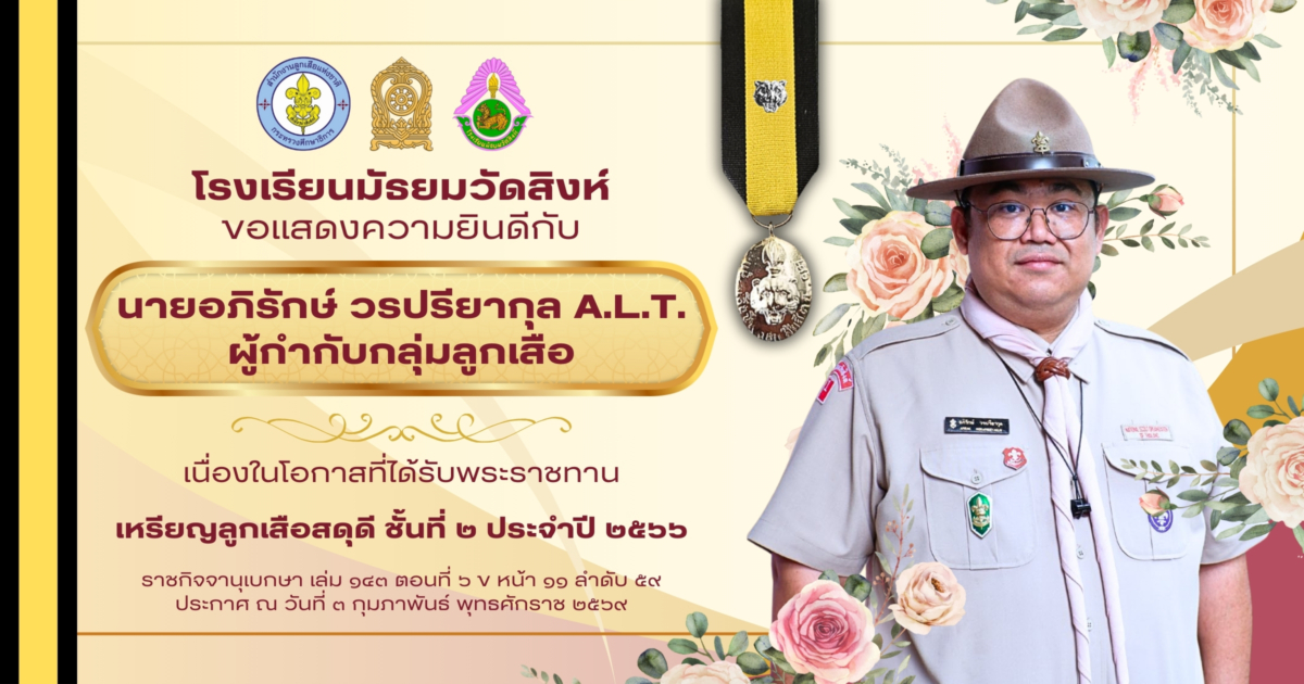 ข้าราชการครู โรงเรียนมัธยมวัดสิงห์ รับพระราชทานเหรียญลูกเสือสดุดี ชั้นที่ 2โดยงานประชาสัมพันธ์ โรงเรียนมัธยมวัดสิงห์วันที่7 กุมภาพันธ์ 2569