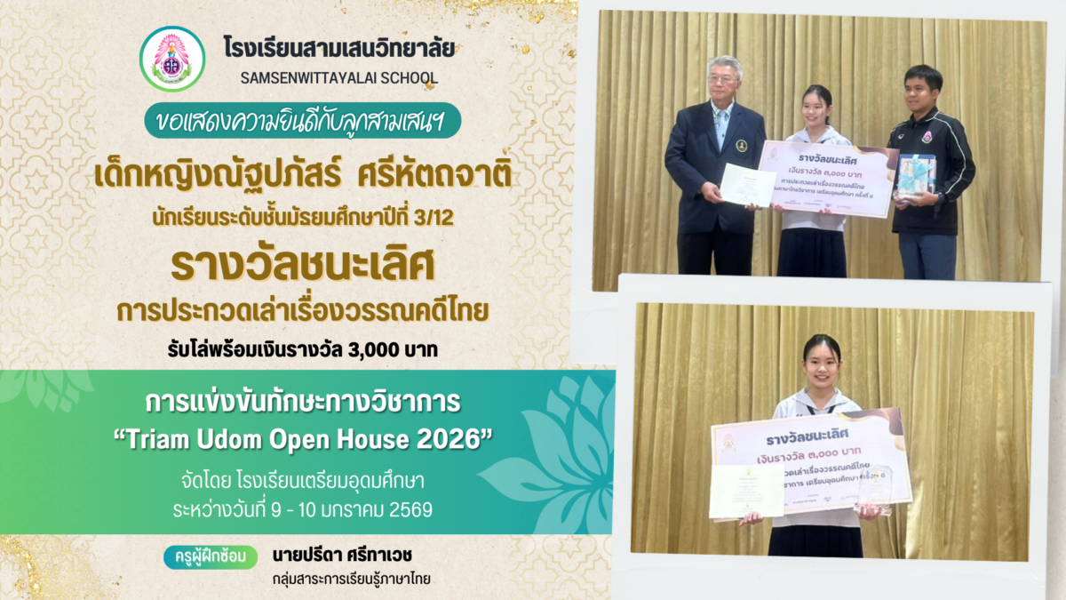 ขอแสดงความยินดี ลูกสามเสนฯ ได้รับรางวัลชนะเลิศ การประกวดเล่าเรื่องวรรณคดีไทย ในงาน “Triam Udom Open House 2026”โดยงานประชาสัมพันธ์ โรงเรียนสามเสนวิทยาลัยวันที่15 มกราคม 256915 มกราคม 2026