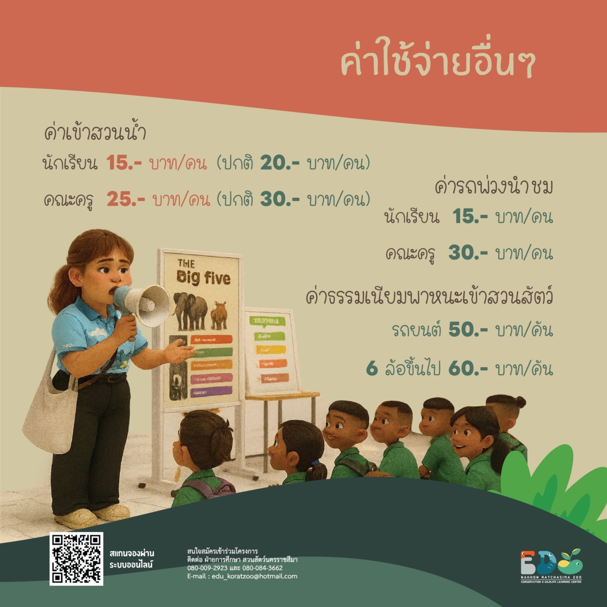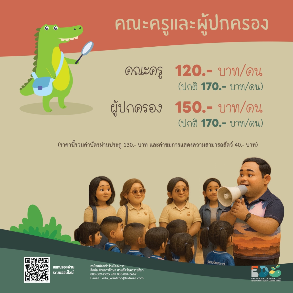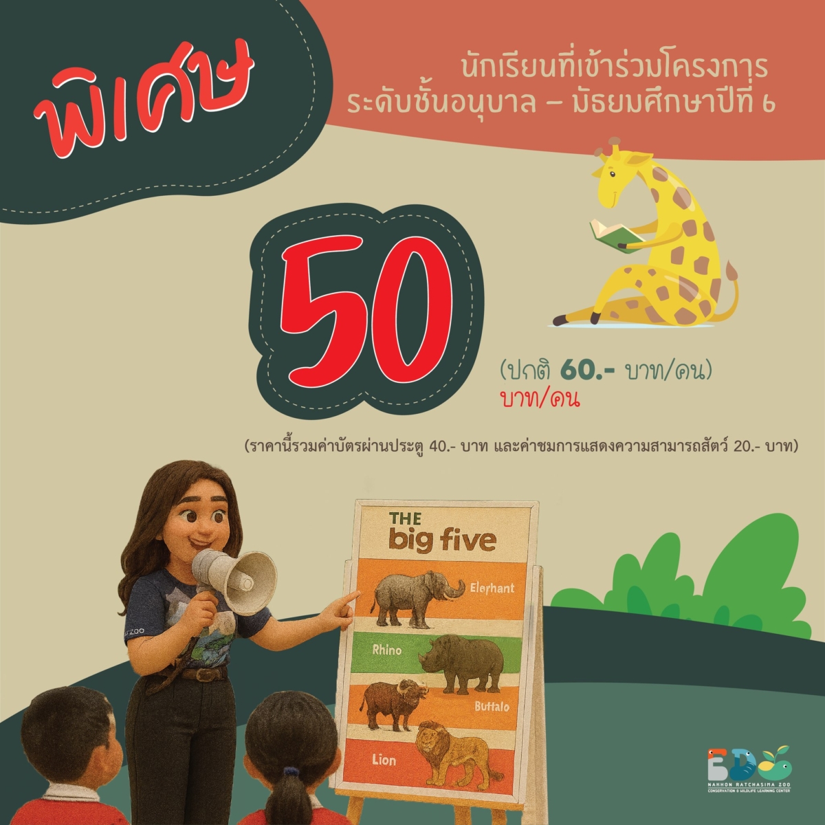 ประชาสัมพันธ์โปรโมชั่นพิเศษ โครงการให้บริการความรู้ประจำปีงบประมาณ 2569 สวนสัตว์นครราชสีมา เพื่อเป็นแหล่งพัฒนาการเรียนรู้ให้กับ นักเรียน/นักศึกษา และผู้สนใจ สอบถามรายละเอียดเพิ่มเติมได้ที่ ฝ่ายการศึกษาสวนสัตว์นครราชสีมา โทร 080 0092923 , 080 0843662