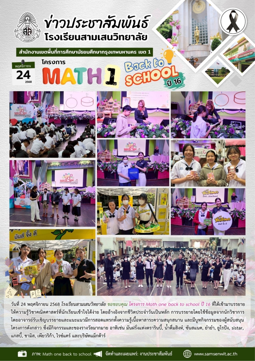 วันที่ 24 พฤศจิกายน 2568 โรงเรียนสามเสนวิทยาลัย ขอขอบคุณ โครงการ Math one back to school ปี 16 ที่ได้เข้ามาบรรยาย ให้ความรู้วิชาคณิตศาสตร์ที่นักเรียนเข้าใจได้ง่าย โดยอ้างอิงจากชีวิตประจำวันเป็นหลัก การบรรยายโดยใช้ข้อมูลจากนักวิชาการ โดยอาจารย์รับเชิญบรรยายและแนะแนวมีการสอดแทรกทั้งความรู้เนื้อหาสาระความสนุกสนาน และมีบูทกิจกรรมของผู้สนับสนุน โครงการดังกล่าว ซึ่งมีกิจกรรมและของรางวัลมากมาย อาทิเช่น มันฝรั่งแท่งตรารินบี้, น้ำดื่มสิงห์, ซันสแนค, ยำยำ, ยูโรปัง, sistar, แกสบี้, ชามิส, เพียวริก้า, ไรซ์แคร์ และบริษัทแม็กต้าร์