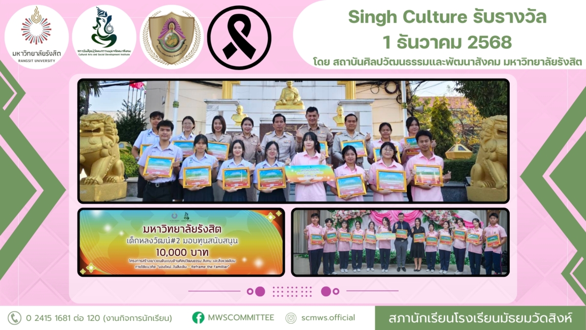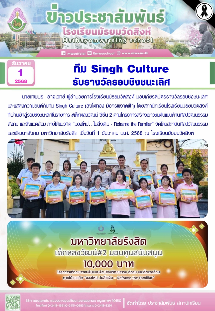 นายเทพพร อาจเวทย์ ผู้อำนวยการโรงเรียนมัธยมวัดสิงห์ มอบเกียรติบัตรรางวัลรอบชิงชนะเลิศ และแสดงความยินดีกับทีม Singh Culture (สิงโตทอง มังกรผงาดฟ้า) โดยสภานักเรียนโรงเรียนมัธยมวัดสิงห์ ที่ผ่านเข้าสู่รอบชิงชนะเลิศในรายการ #เด็กหลงวัฒน์ ซีซั่น 2 ตามโครงการสร้างเยาวชนต้นแบบด้านศิลปวัฒนธรรม สังคม และสิ่งแวดล้อม ภายใต้แนวคิด “มองใหม่…ในสิ่งเดิม – Reframe the Familiar” จัดโดยสถาบันศิลปวัฒนธรรมและพัฒนาสังคม มหาวิทยาลัยรังสิต เมื่อวันที่ 1 ธันวาคม พ.ศ. 2568 ณ โรงเรียนมัธยมวัดสิงห์