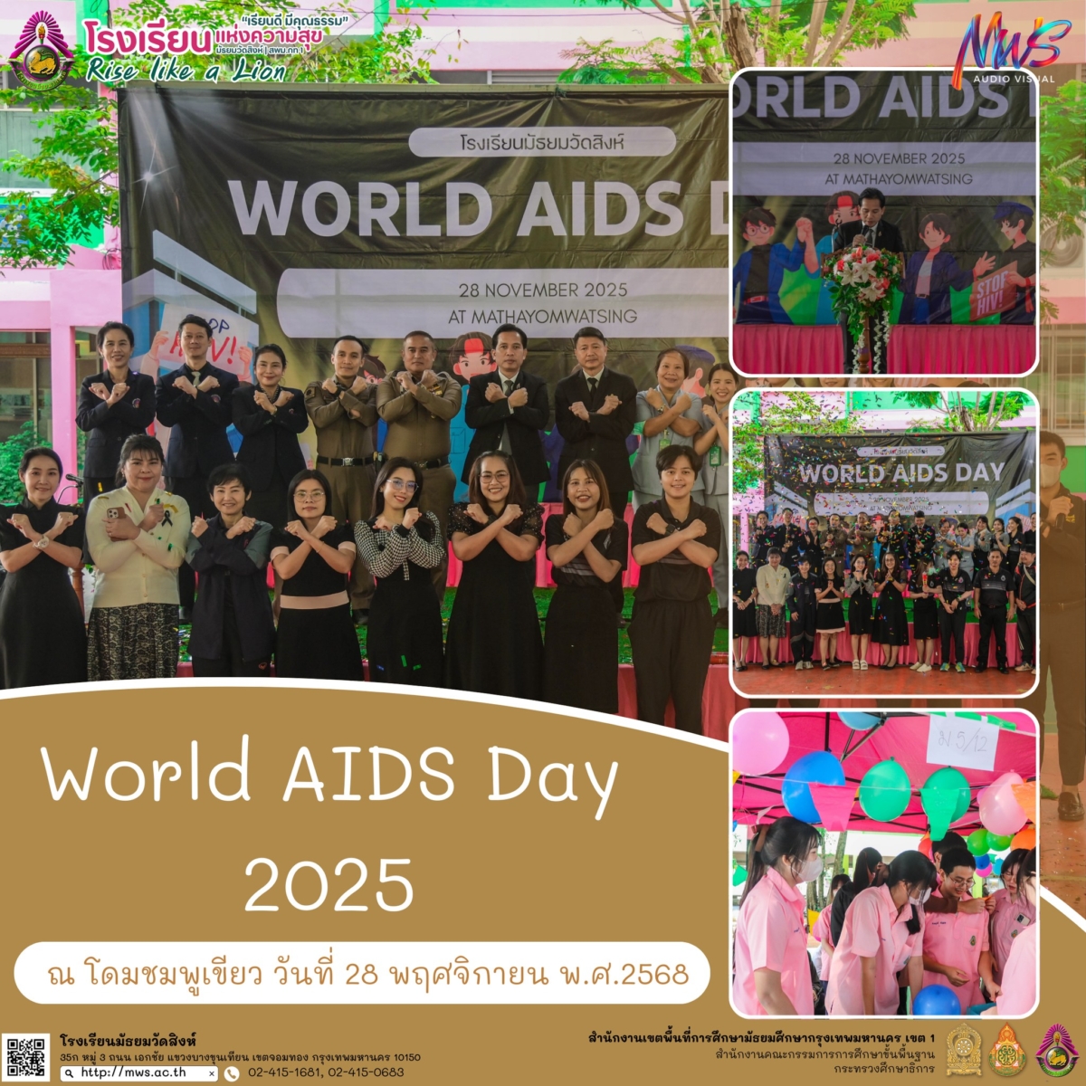 นายเทพพร อาจเวทย์ ผู้อำนวยการโรงเรียนมัธยมวัดสิงห์ เป็นประธานเปิดกิจกรรม World AIDS Day 2025 ซึ่งจัดขึ้นเพื่อให้ความรู้เกี่ยวกับโรคเอดส์ การป้องกันตนเอง และสร้างความตระหนักรู้ในหมู่นักเรียน บรรยากาศภายในงานเต็มไปด้วยความสนใจจากนักเรียนที่ร่วมกิจกรรมอย่างคึกคัก เมื่อวันที่ 28 พฤศจิกายน พ.ศ.2568 ณ โดมชมพูเขียว โรงเรียนมัธยมวัดสิงห์