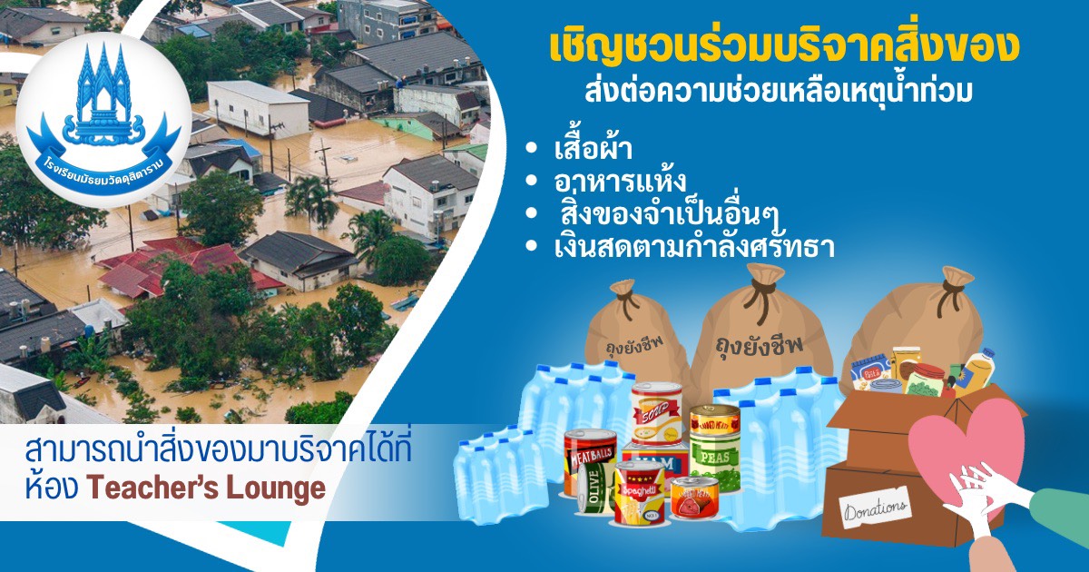 วันอังคารที่ 2 ธันวาคม 2568 โรงเรียนมัธยมวัดดุสิตาราม โดย นายสุรศักดิ์ เวียนรอบ ผู้อำนวยการโรงเรียนมัธยมวัดดุสิตาราม มอบหมายให้ นายรณยุทธ สังสุทธิ์ รองผู้อำนวยการโรงเรียน ร่วมมอบสิ่งของบริจาค อุปโภคบริโภค และปัจจัย ช่วยเหลือผู้ประสบภัยน้ำท่วมภาคใต้ ณ สำนักงานคณะกรรมการการศึกษาขั้นพื้นฐาน