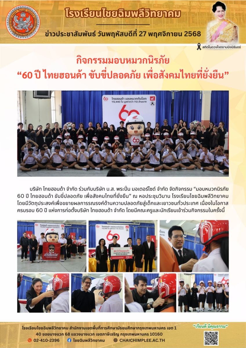 บริษัท ไทยฮอนด้า จำกัด ร่วมกับบริษัท บ.ส. พระปิ่น มอเตอร์ไซด์ จำกัด จัดกิจกรรม “มอบหมวกนิรภัย 60 ปี ไทยฮอนด้า ขับขี่ปลอดภัย เพื่อสังคมไทยที่ยั่งยืน” ณ หอประชุมวิมาน โรงเรียนไชอิบพลีวิทยาคม โดยมีวัตถุประสงค์เพื่อขยายผลการรณรงค์ด้านความปลอดภัยสู่เด็กและเยาวชนทั่วประเทศ เนื่องในโอกาสครบรอบ 60 ปี แห่งการก่อตั้งบริษัท ไทยฮอนด้า จำกัด โดยมีคณะครูและนักเรียนเข้าร่วมกิจกรรมในครั้งนี้