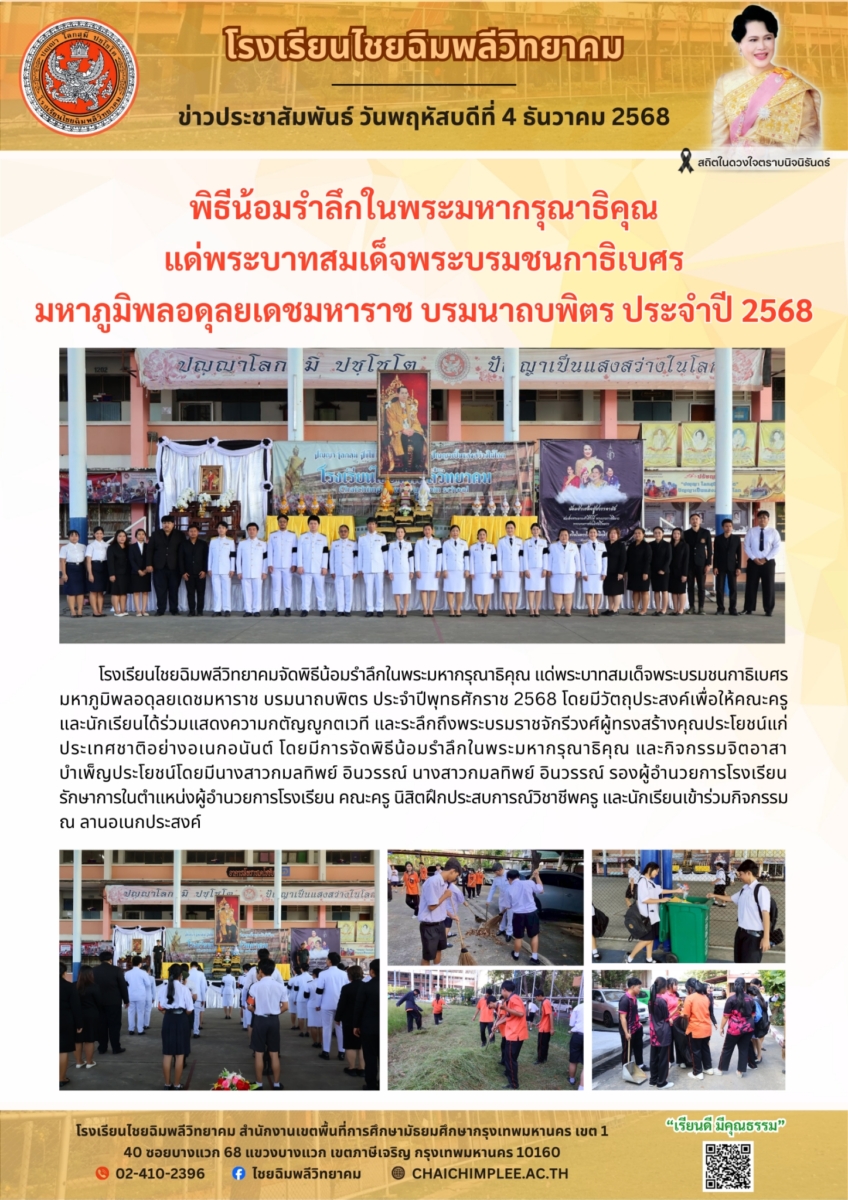 โรงเรียนไชยฉิมพลีวิทยาคมจัดพิธีน้อมรำลึกในพระมหากรุณาธิคุณ แด่พระบากสมเด็จพระบรมชนกาธิเบศร มหาภูมิพลอดุลยเดชมหาราช บรมนาถบพิตร ประจำปีพุทธศักราช 2568 โดยมีวัตถุประสงค์เพื่อให้คณะครูและนักเรียนได้ร่วมแสดงความกตัญญญตเวที และระลึกถึงพระบรมราชจักรีวงศ์ ผู้ทรงสร้างคุณประโยชน์แก่ประเทศชาติอย่างอเนกอนันต์ โดยมีการจัดพิธีน้อมรำลึกในพระมหากรุณาธิคุณ และกิจกรรมจิตอาสาบำเพ็ญประโยชน์โดยมีนางสาวกมลทิพย์ อินวรรรณ์ รองผู้อำนวยการโรงเรียน รักษาการในตำแหน่งผู้อำนวยการโรงเรียน คณะครู นิสิตฝึกประสบการณ์วิชาชีพครู และนักเรียนเข้าร่วมกิจกรรม ณ ลานอเนกประสงค์