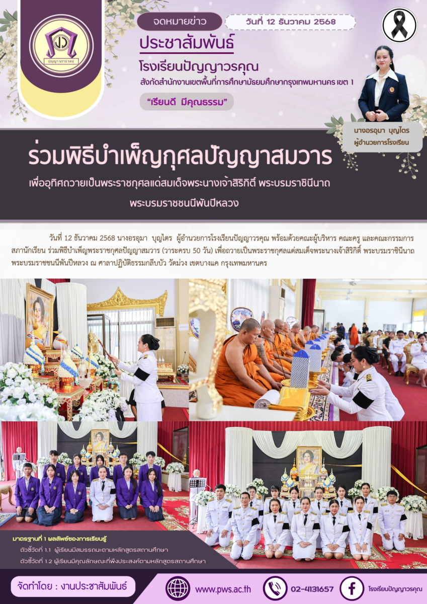นางอรอุมา บุญโตร ผู้อำนวยการโรงเรียนปัญญาวรคุณ พร้อมด้วยคณะผู้บริหาร คณะครู และคณะกรรมการ สภานักเรียน ร่วมพิธีบำเพ็ญพระราชกุศลปัญญาสมวาร (วาระครบ 50 วัน) เพื่อถวายเป็นพระราชกุศลแด่สมเด็จพระนางเจ้าสิริกิติ์ พระบรมราชินีนาถ พระบรมราชชนนีพันปีหลวง ณ ศาลาปฏิบัติธรรมกลีบบัว วัดม่วง เขตบางแค กรุงเทพมหานคร