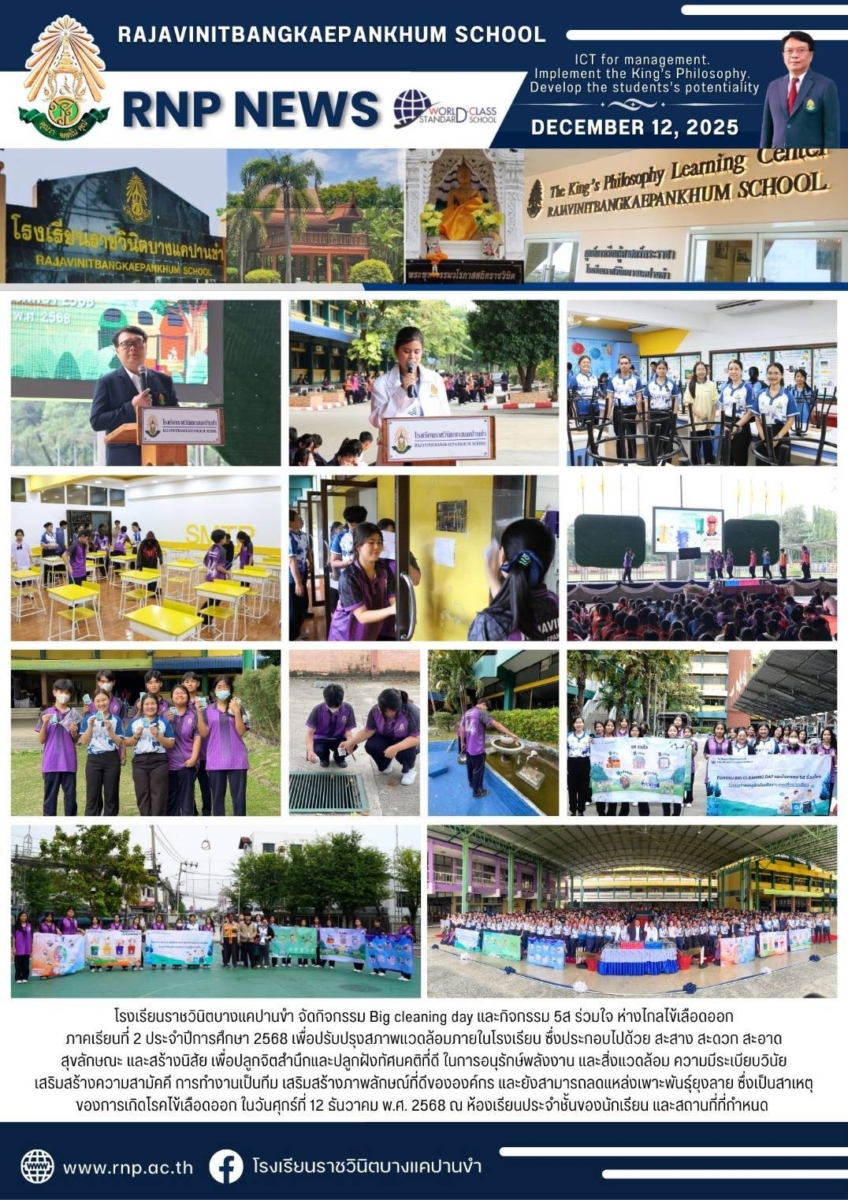 โรงเรียนราชวินิตบางแคปานขำ ได้จัดกิจกรรม “Big Cleaning Day และกิจกรรม 5ส ร่วมใจ ห่างไกลไข้เลือดออก” ภาคเรียนที่ 2 ประจำปีการศึกษา 2568 ในวันศุกร์ที่ 12 ธันวาคม พ.ศ. 2568 ณ ห้องเรียนประจำชั้นของนักเรียน และบริเวณสถานที่ที่กำหนดภายในโรงเรียน เพื่อปรับปรุงและพัฒนาสภาพแวดล้อมให้มีความสะอาด เป็นระเบียบ และเอื้อต่อการจัดการเรียนการสอน