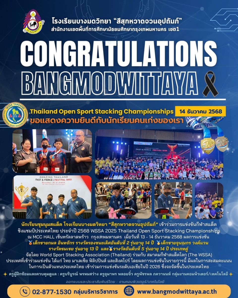 โรงเรียนบางมดวิทยา “สีสุกหวาดจวนอุปถัมภ์” ขอแสดงความยินดีกับคุณครูและนักเรียน ในการแข่งขันกีฬาสแต็คชิงแชมป์ประเทศไทย ประจำปี 2568 WSSA 2025 Thailand Open Sport Stacking Championships