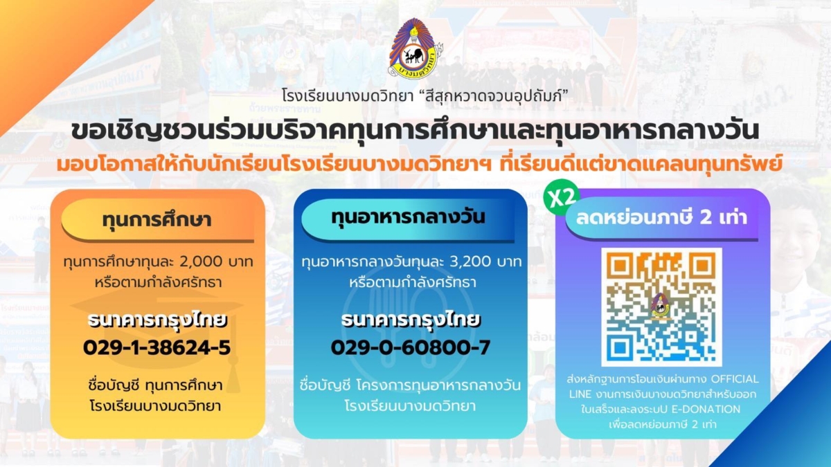 โรงเรียนบางมดวิทยา“สีสุกหวาดจวนอุปถัมภ์” ขอเชิญชวนผู้ปกครอง แฟนเพจ และผู้เสียภาษีทุกท่าน ร่วมบริจากเงินเพื่อเป็นทุนการศึกษาและทุนอาหารกลางวันให้กับนักเรียนที่ขาดทุนทรัพย์