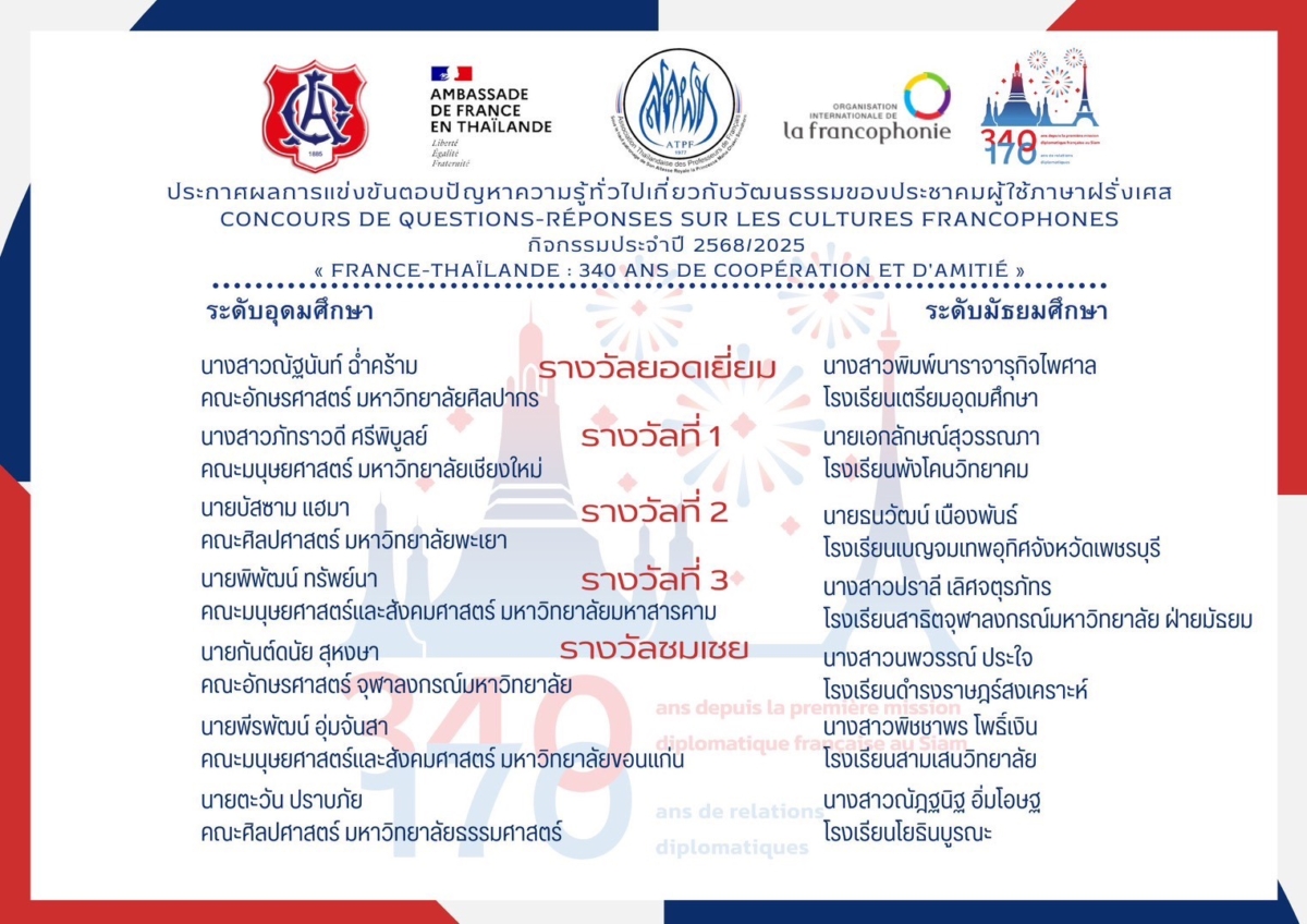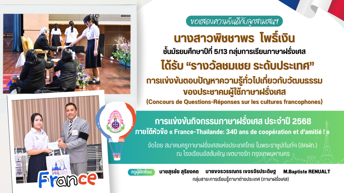 “รางวัลชมเชย ระดับประเทศ” การแข่งขันตอบปัญหาความรู้ทั่วไปเกี่ยวกับวัฒนธรรมของประชาคมผู้ใช้ภาษาฝรั่งเศส