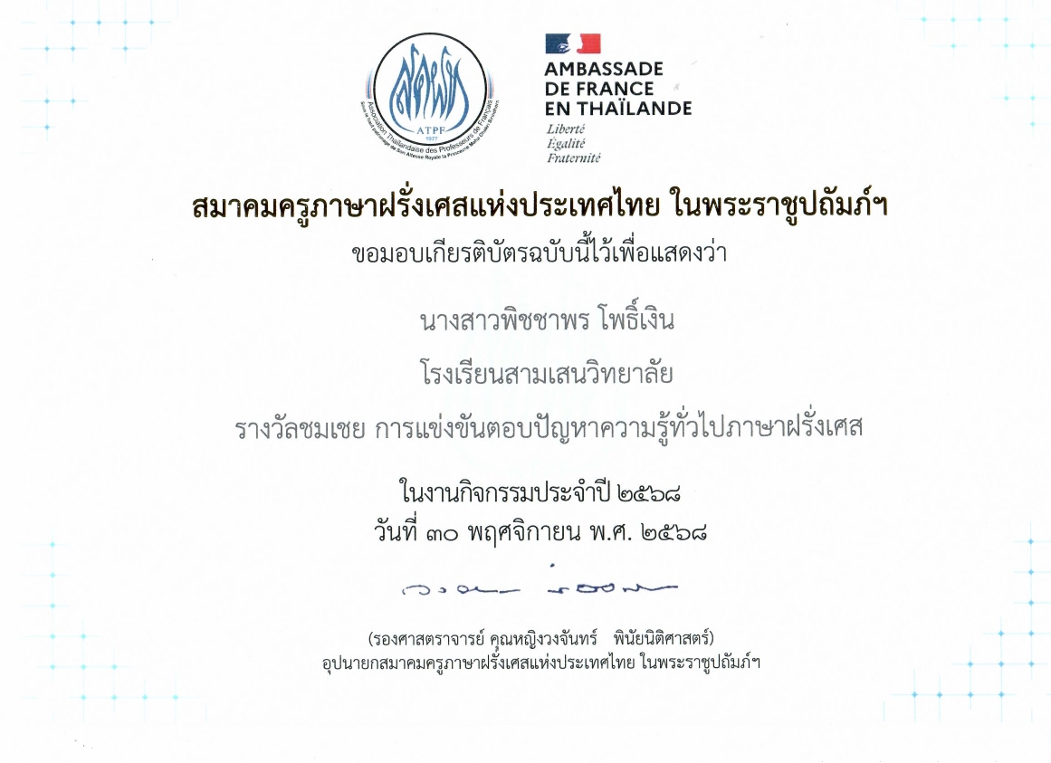 โรงเรียนสามเสนวิทยาลัย ขอแสดงความยินดีกับนักเรียนกลุ่มการเรียนภาษาฝรั่งเศสที่ได้รับ
