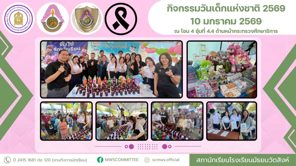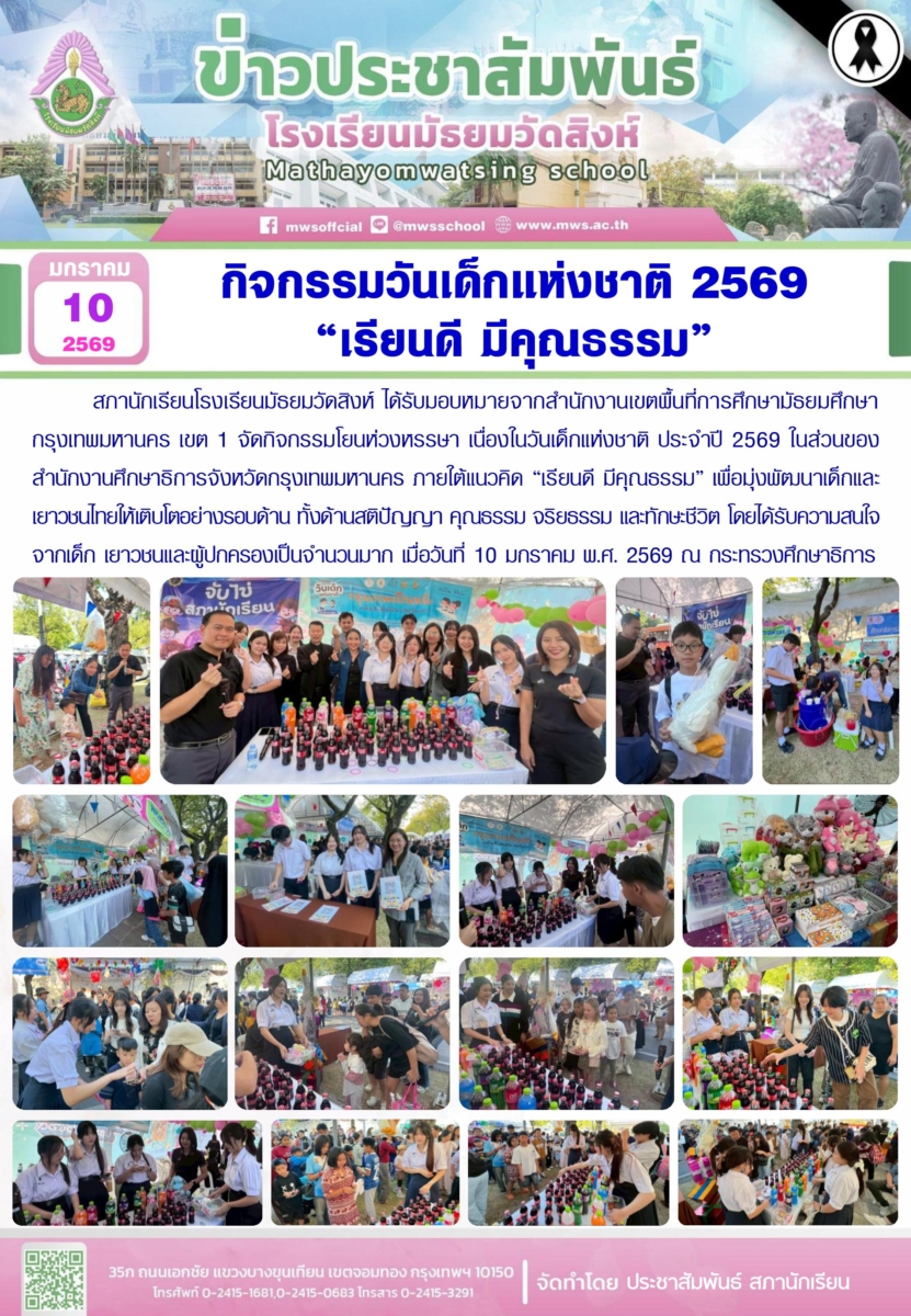 สภานักเรียนโรงเรียนมัธยมวัดสิงห์ ได้รับมอบหมายจากสำนักงานเขตพื้นที่การศึกษามัธยมศึกษากรุงเทพมหานคร เขต 1 จัดกิจกรรมโยนห่วงหรรษา เนื่องในวันเด็กแห่งชาติ ประจำปี 2569 ในส่วนของสำนักงานศึกษาธิการจังหวัดกรุงเทพมหานคร ภายใต้แนวคิด “เรียนดี มีคุณธรรม” เพื่อมุ่งพัฒนาเด็กและเยาวชนไทยให้เติบโตอย่างรอบด้าน ทั้งด้านสติปัญญา คุณธรรม จริยธรรม และทักษะชีวิต โดยได้รับความสนใจจากเด็ก เยาวชนและผู้ปกครองเป็นจำนวนมาก เมื่อวันที่ 10 มกราคม พ.ศ. 2569 ณ กระทรวงศึกษาธิการ