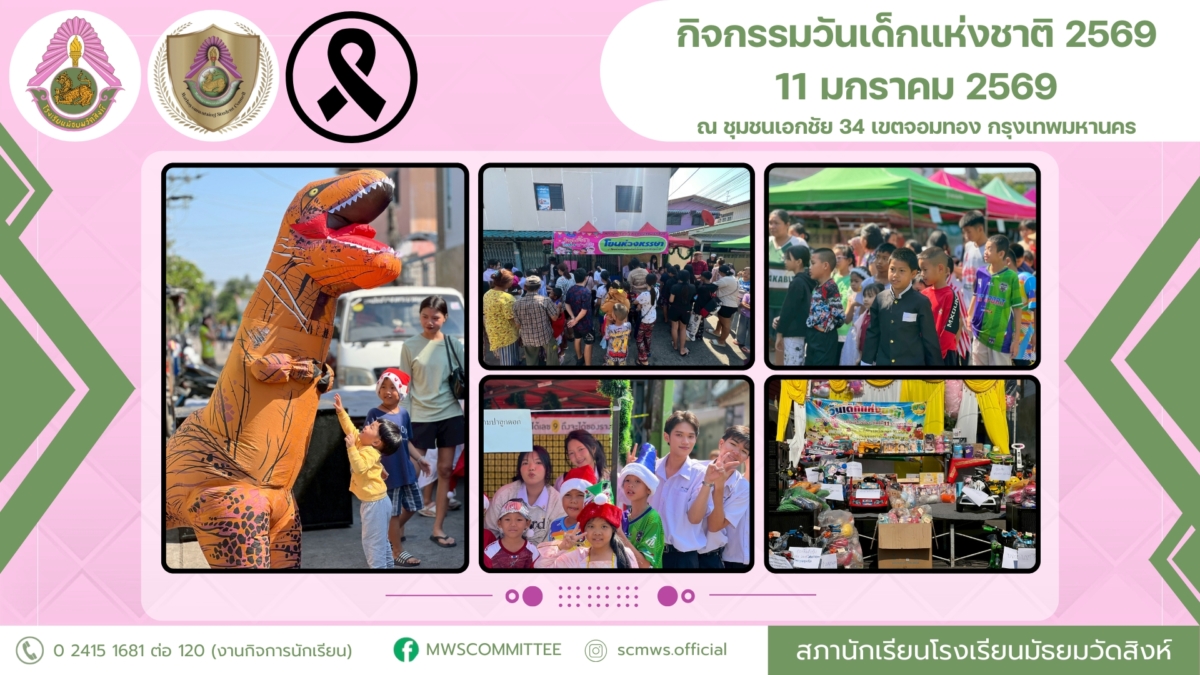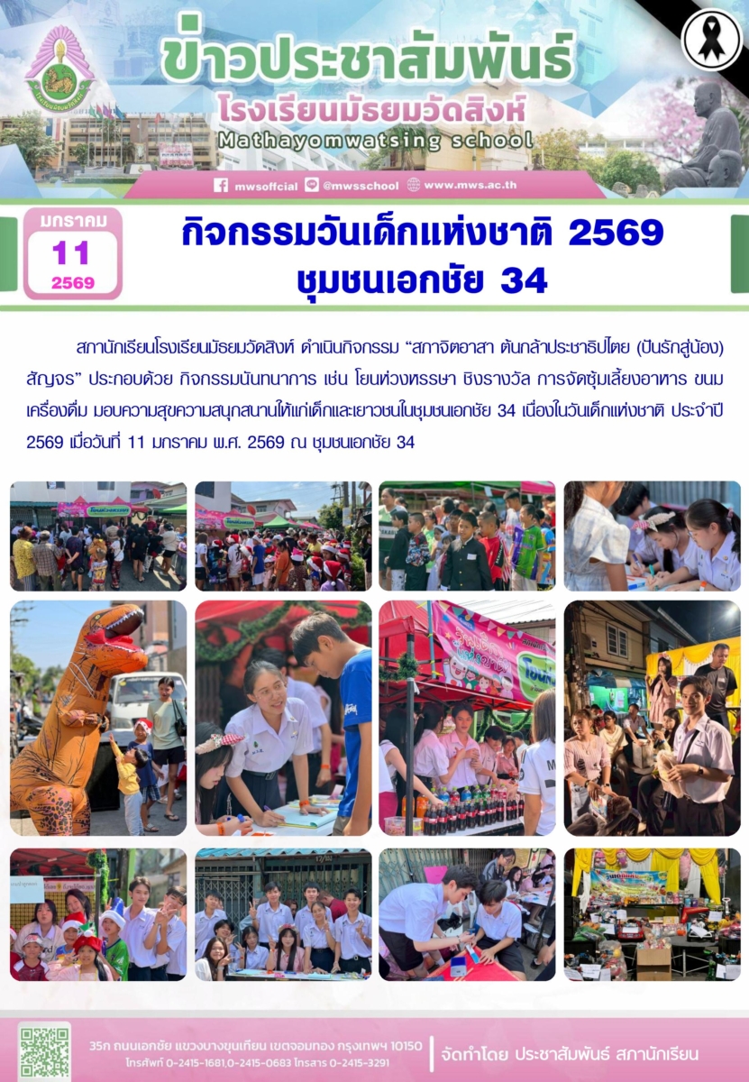 สภานักเรียนโรงเรียนมัธยมวัดสิงห์ ดำเนินกิจกรรม “สภาจิตอาสา ต้นกล้าประชาธิปไตย (ปันรักสู่น้อง) สัญจร” ประกอบด้วย กิจกรรมนันทนาการ เช่น โยนห่วงหรรษา ชิงรางวัล การจัดซุ้มเลี้ยงอาหาร ขนม เครื่องดื่ม มอบความสุขความสนุกสนานให้แก่เด็กและเยาวชนในชุมชนเอกชัย 34 เนื่องในวันเด็กแห่งชาติ ประจำปี 2569 เมื่อวันที่ 11 มกราคม พ.ศ. 2569 ณ ชุมชนเอกชัย 34
