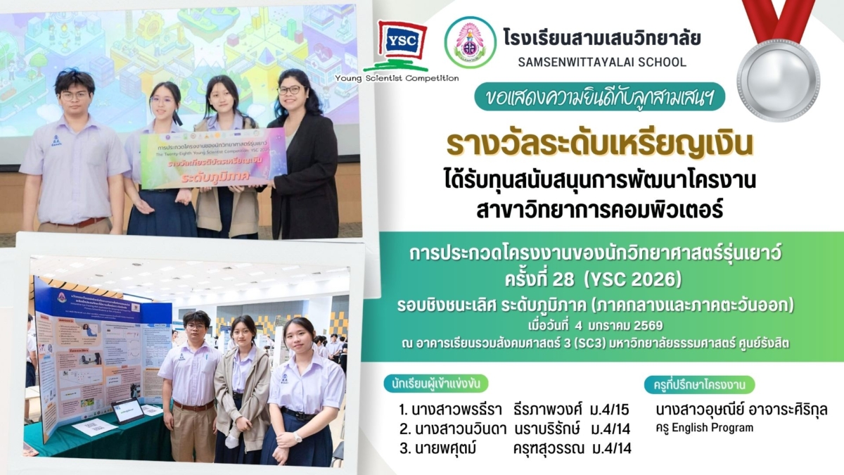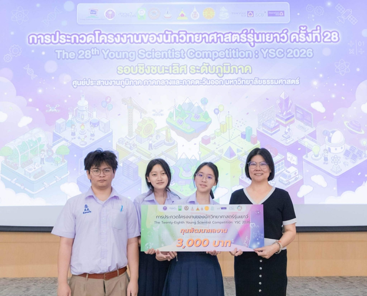 การประกวดโครงงานของนักวิทยาศาสตร์รุ่นเยาว์ ครั้งที่ 28 (Young Scientist Competition: YSC 2026) รอบชิงชนะเลิศ ระดับภูมิภาค (ภาคกลางและภาคตะวันออก) ณ อาคารเรียนรวมสังคมศาสตร์ 3 (SC3) มหาวิทยาลัยธรรมศาสตร์ ศูนย์รังสิต เมื่อวันที่ 4 มกราคม 2569 จัดโดย สำนักงานพัฒนาวิทยาศาสตร์และเทคโนโลยีแห่งชาติ (สวทช.) ร่วมกับ คณะวิศวกรรมศาสตร์ มหาวิทยาลัยธรรมศาสตร์