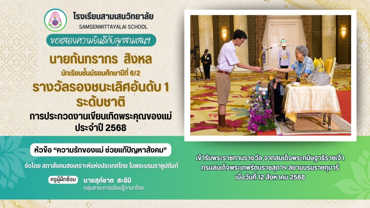 ลูกสามเสนฯ ได้รับรางวัลรองชนะเลิศอันดับ 1 ระดับชาติ การประกวดงานเขียนเทิดพระคุณของแม่ ประจำปี 2568 เข้ารับพระราชทานรางวัล จากสมเด็จพระกนิษฐาธิราชเจ้า กรมสมเด็จพระเทพรัตนราชสุดาฯ สยามบรมราชกุมารี