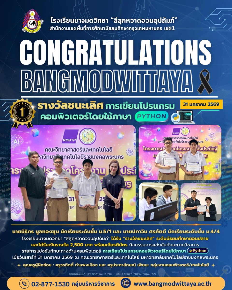 โรงเรียนบางมดวิทยา “สีสุกหวาดจวนอุปถัมภ์” ขอแสดงความยินดีกับคุณครูและนักเรียนคนเก่ง ได้รับ “รางวัลชนะเลิศ” ระดับมัธยมศึกษาตอนปลาย กิจกรรมการแข่งขันทักษะทางวิชาการ การเขียนโปรแกรมคอมพิวเตอร์โดยใช้ภาษา Python