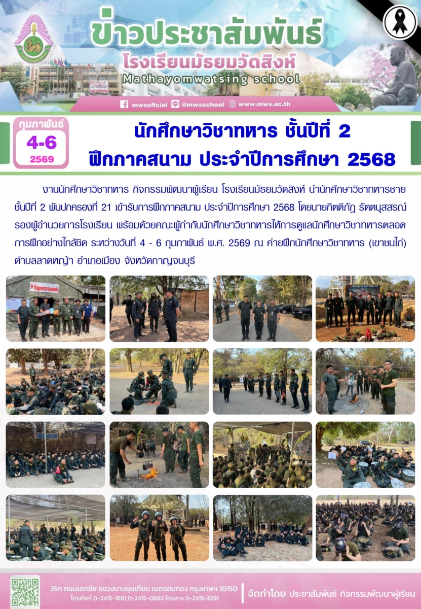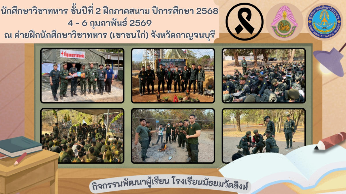 งานนักศึกษาวิชาทหาร กิจกรรมพัฒนาผู้เรียน โรงเรียนมัธยมวัดสิงห์ นำนักศึกษาวิชาทหารชาย ชั้นปีที่ 2 พันปกครองที่ 21 เข้ารับการฝึกภาคสนาม ประจำปีการศึกษา 2568 โดยนายกิตติภัฎ รัตตนุสสรณ์ รองผู้อำนวยการโรงเรียน พร้อมด้วยคณะผู้กำกับนักศึกษาวิชาทหารให้การดูแลนักศึกษาวิชาทหารตลอดการฝึกอย่างใกล้ชิด ระหว่างวันที่ 4 – 6 กุมภาพันธ์ พ.ศ. 2569 ณ ค่ายฝึกนักศึกษาวิชาทหาร (เขาชนไก่) ตำบลลาดหญ้า อำเภอเมือง จังหวัดกาญจนบุรี