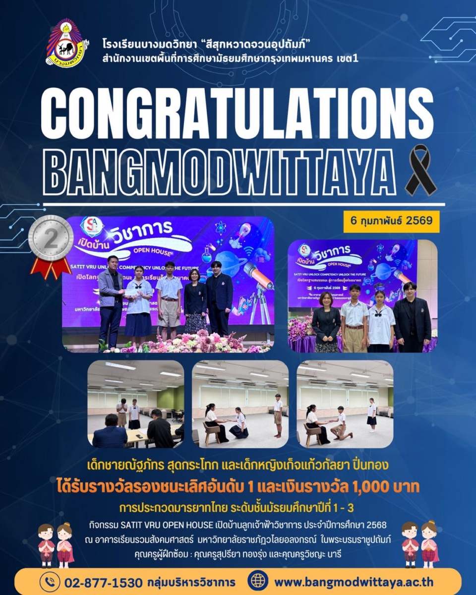 โรงเรียนบางมดวิทยา “สีสุกหวาดจวนอุปถัมภ์”ขอแสดงความยินดีกับคุณครูและนักเรียนคนเก่ง การประกวดมารยาทไทย ระดับชั้นมัธยมศึกษาปีที่ 1 – 3