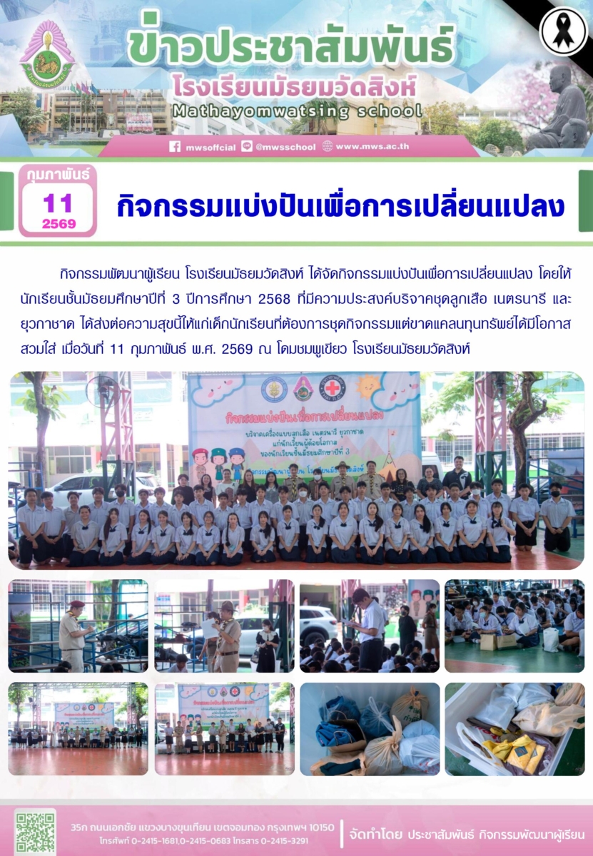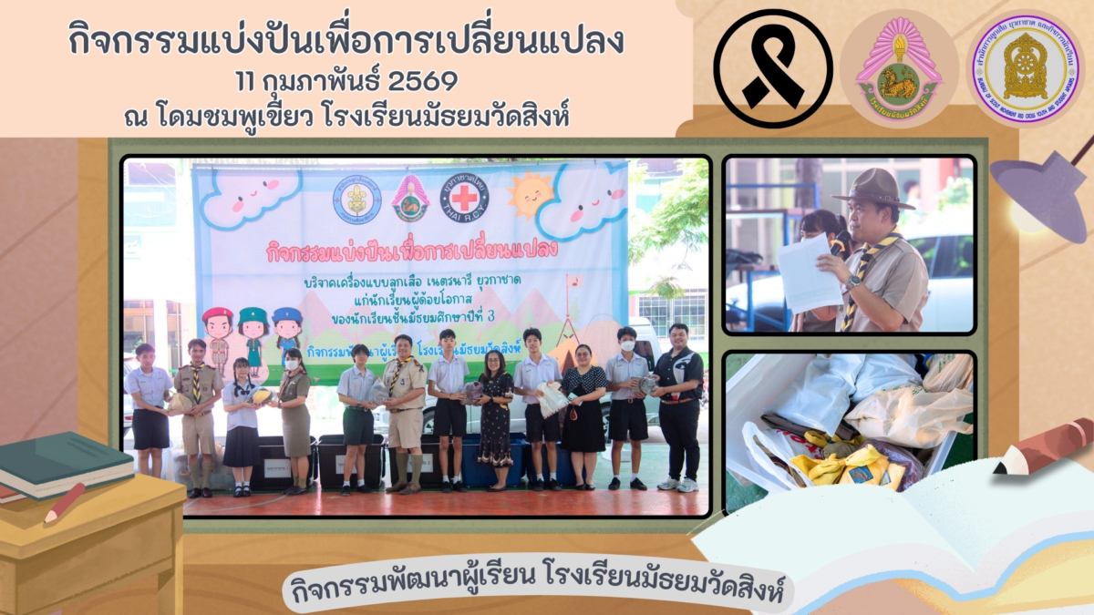 กิจกรรมพัฒนาผู้เรียน โรงเรียนมัธยมวัดสิงห์ ได้จัดกิจกรรมแบ่งปันเพื่อการเปลี่ยนแปลง โดยให้นักเรียนชั้นมัธยมศึกษาปีที่ 3 ปีการศึกษา 2568 ที่มีความประสงค์บริจาคชุดลูกเสือ เนตรนารี และยุวกาชาด ได้ส่งต่อความสุขนี้ให้แก่เด็กนักเรียนที่ต้องการชุดกิจกรรมแต่ขาดแคลนทุนทรัพย์ได้มีโอกาสสวมใส่ เมื่อวันที่ 11 กุมภาพันธ์ พ.ศ. 2569 ณ โดมชมพูเขียว โรงเรียนมัธยมวัดสิงห์