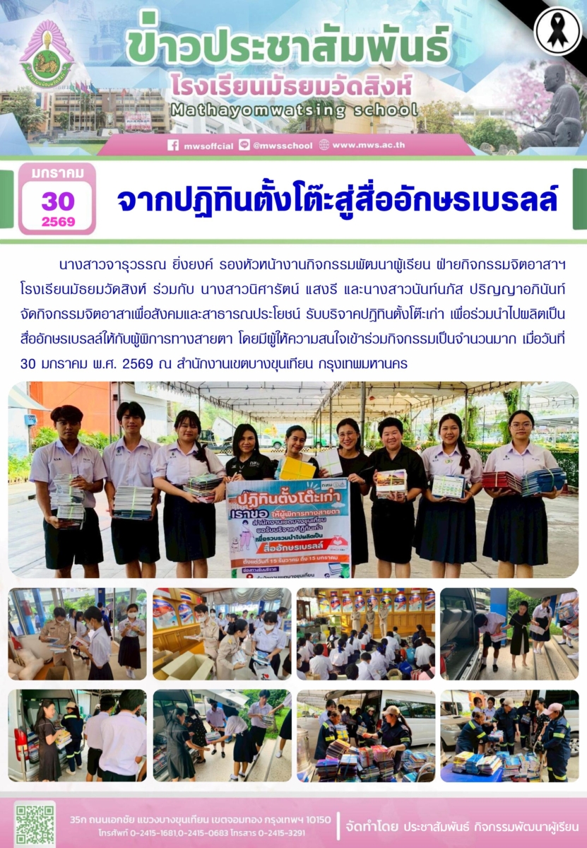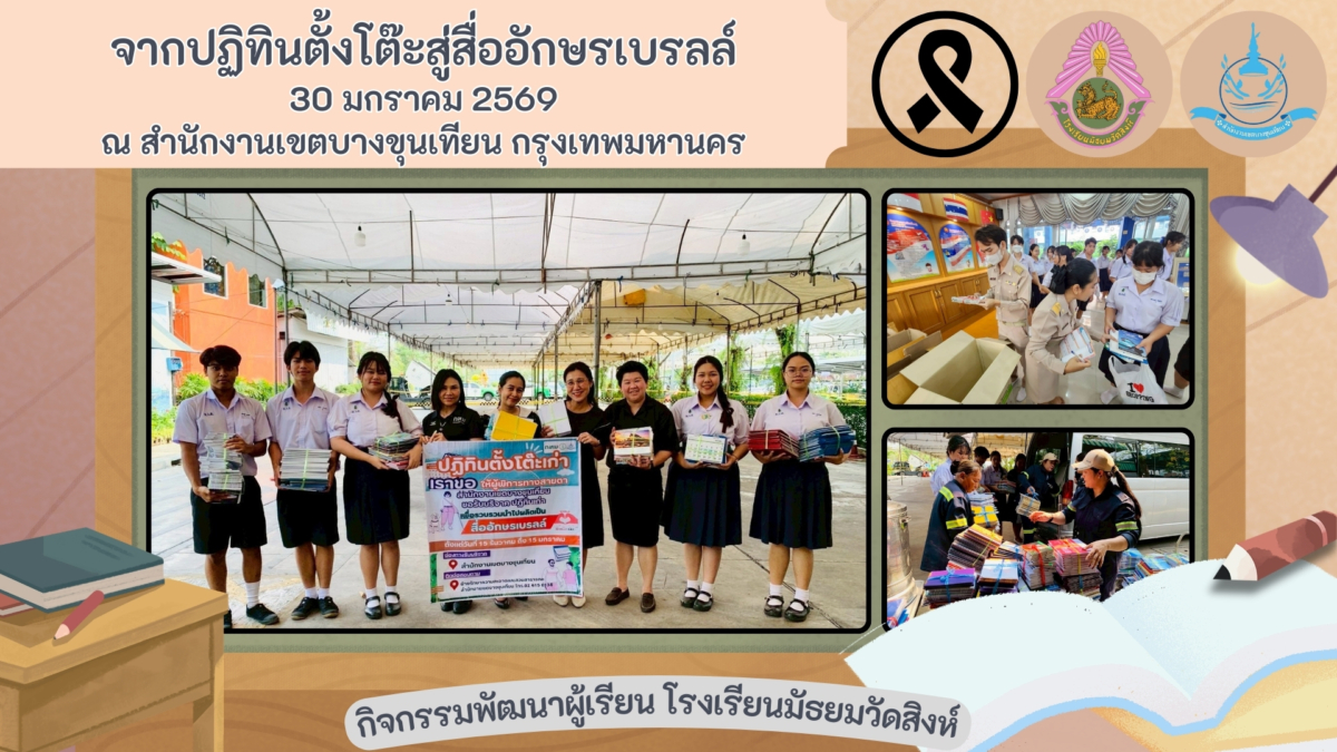 นางสาวจารุวรรณ ยิ่งยงค์ รองหัวหน้างานกิจกรรมพัฒนาผู้เรียน ฝ่ายกิจกรรมจิตอาสาฯ โรงเรียนมัธยมวัดสิงห์ ร่วมกับ นางสาวนิศารัตน์ แสงรี และนางสาวนันท์นภัส ปริญญาอภินันท์ จัดกิจกรรมจิตอาสาเพื่อสังคมและสาธารณประโยชน์ รับบริจาคปฏิทินตั้งโต๊ะเก่า เพื่อร่วมนำไปผลิตเป็นสื่ออักษรเบรลล์ให้กับผู้พิการทางสายตา โดยมีผู้ให้ความสนใจเข้าร่วมกิจกรรมเป็นจำนวนมาก เมื่อวันที่ 30 มกราคม พ.ศ. 2569 ณ สำนักงานเขตบางขุนเทียน กรุงเทพมหานคร