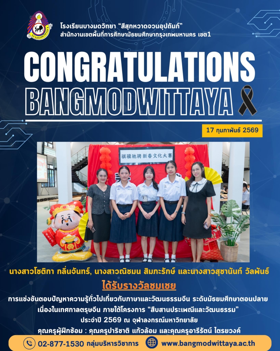 โรงเรียนบางมดวิทยา “สีสุกหวาดจวนอุปถัมภ์”ขอแสดงความยินดีกับคุณครูและนักเรียนคนเก่ง