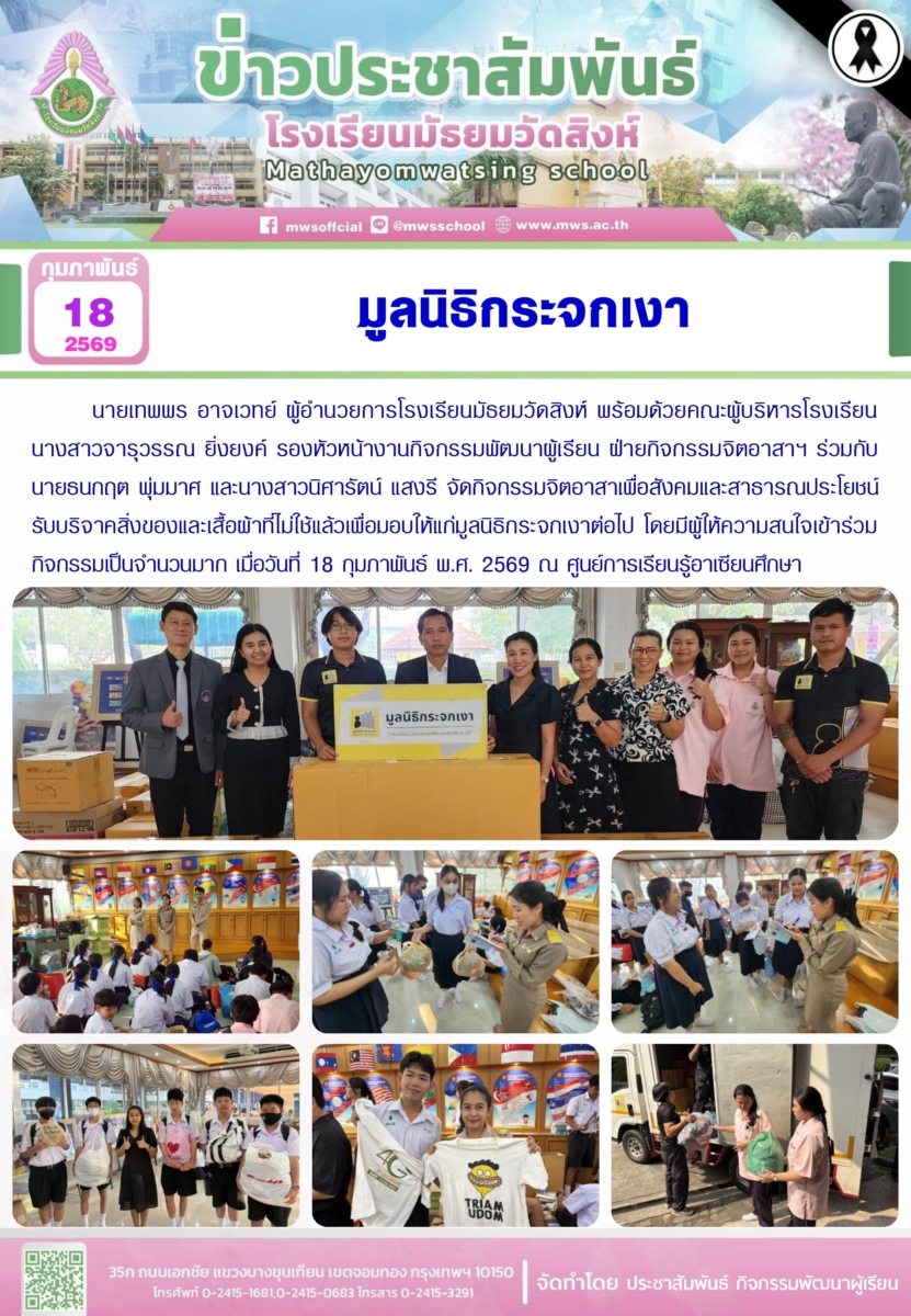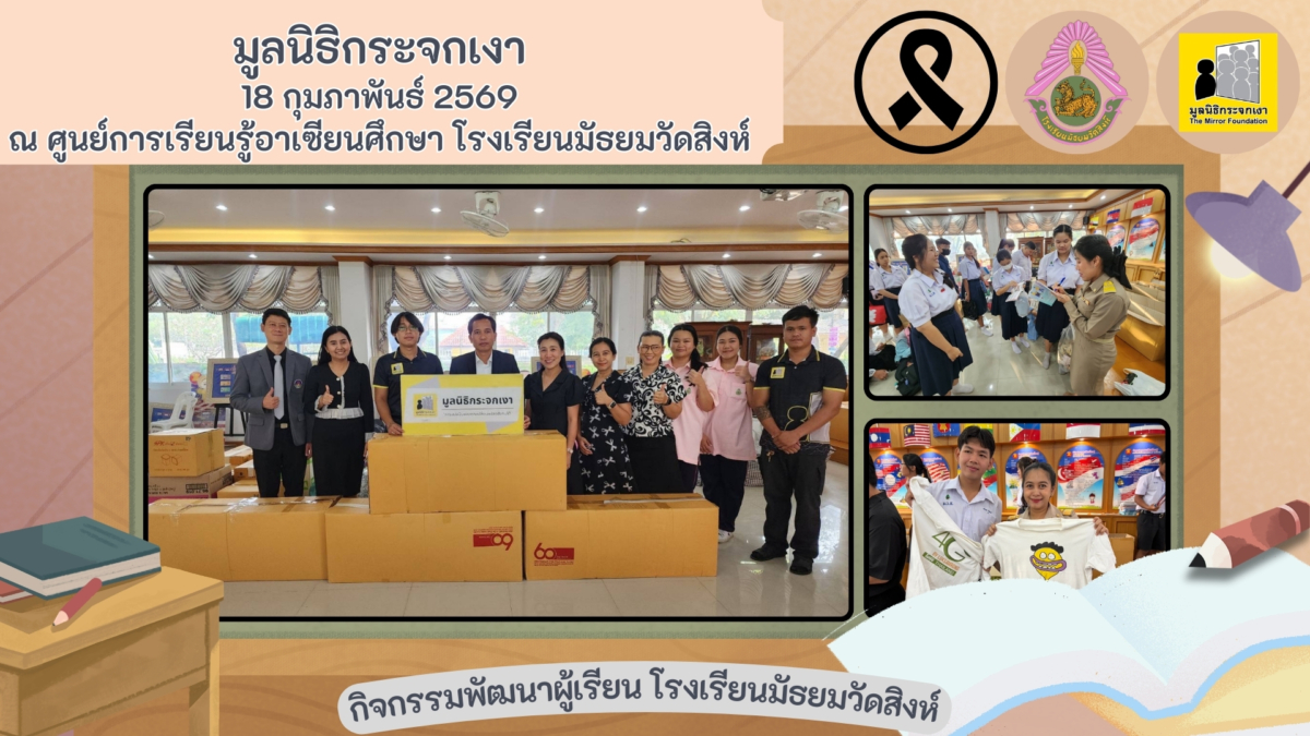 นายเทพพร อาจเวทย์ ผู้อำนวยการโรงเรียนมัธยมวัดสิงห์ พร้อมด้วยคณะผู้บริหารโรงเรียน นางสาวจารุวรรณ ยิ่งยงค์ รองหัวหน้างานกิจกรรมพัฒนาผู้เรียน ฝ่ายกิจกรรมจิตอาสาฯ โรงเรียนมัธยมวัดสิงห์ ร่วมกับ นายธนกฤต พุ่มมาศ และนางสาวนิศารัตน์ แสงรี จัดกิจกรรมจิตอาสาเพื่อสังคมและสาธารณประโยชน์ รับบริจาคสิ่งของและเสื้อผ้าที่ไม่ใช้แล้วเพื่อมอบให้แก่มูลนิธิกระจกเงาต่อไป โดยมีผู้ให้ความสนใจเข้าร่วมกิจกรรมเป็นจำนวนมาก เมื่อวันที่ 18 กุมภาพันธ์ พ.ศ. 2569 ณ ศูนย์การเรียนรู้อาเซียนศึกษา โรงเรียนมัธยมวัดสิงห์