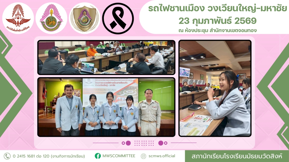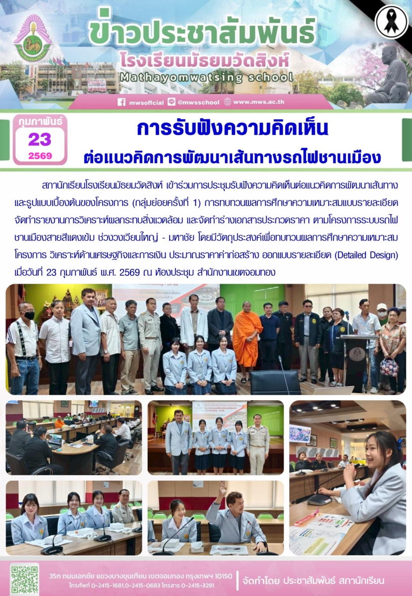 สภานักเรียนโรงเรียนมัธยมวัดสิงห์ เข้าร่วมการประชุมรับฟังความคิดเห็นต่อแนวคิดการพัฒนาเส้นทางและรูปแบบเบื้องต้นของโครงการ (กลุ่มย่อยครั้งที่ 1) การทบทวนผลการศึกษาความเหมาะสมแบบรายละเอียด จัดทำรายงานการวิเคราะห์ผลกระทบสิ่งแวดล้อม และจัดทำร่างเอกสารประกวดราคา ตามโครงการระบบรถไฟชานเมืองสายสีแดงเข้ม ช่วงวงเวียนใหญ่ – มหาชัย ระหว่างวันที่ 19 – 24 กุมภาพันธ์ พ.ศ. 2569 โดยมีวัตถุประสงค์เพื่อทบทวนผลการศึกษาความเหมาะสมโครงการ วิเคราะห์ด้านเศรษฐกิจและการเงิน ประมาณราคาค่าก่อสร้าง ออกแบบรายละเอียด (Detailed Design) เมื่อวันที่ 23 กุมภาพันธ์ พ.ศ. 2569 ณ ห้องประชุม สำนักงานเขตจอมทอง