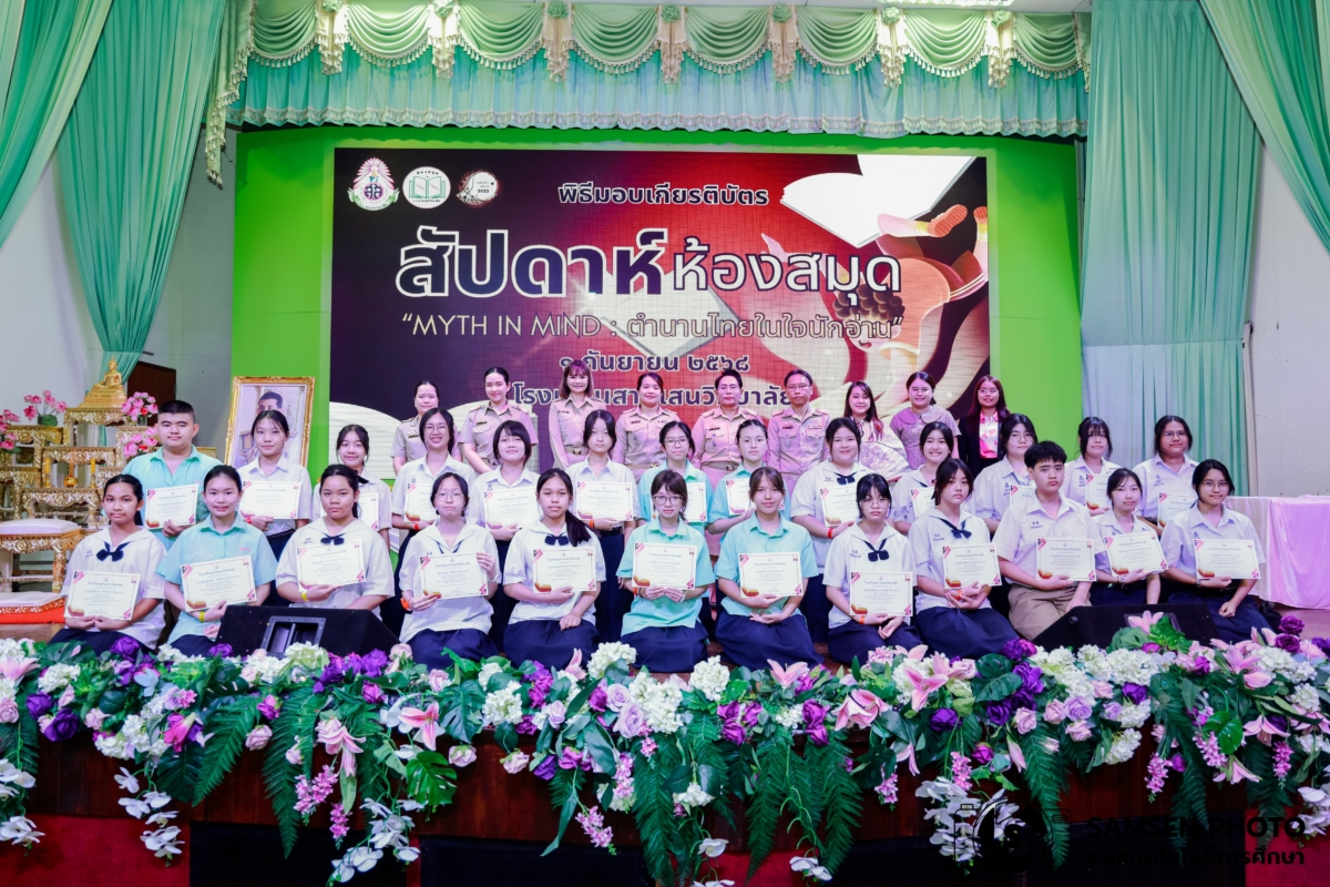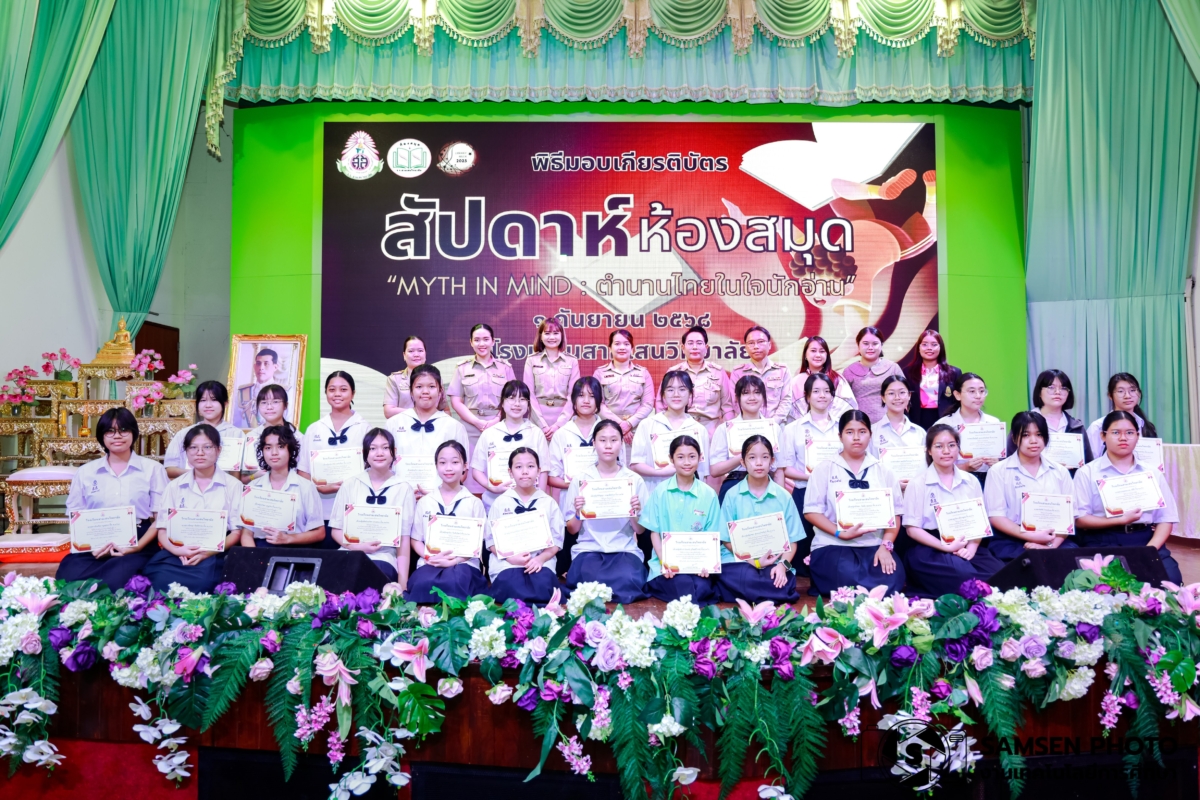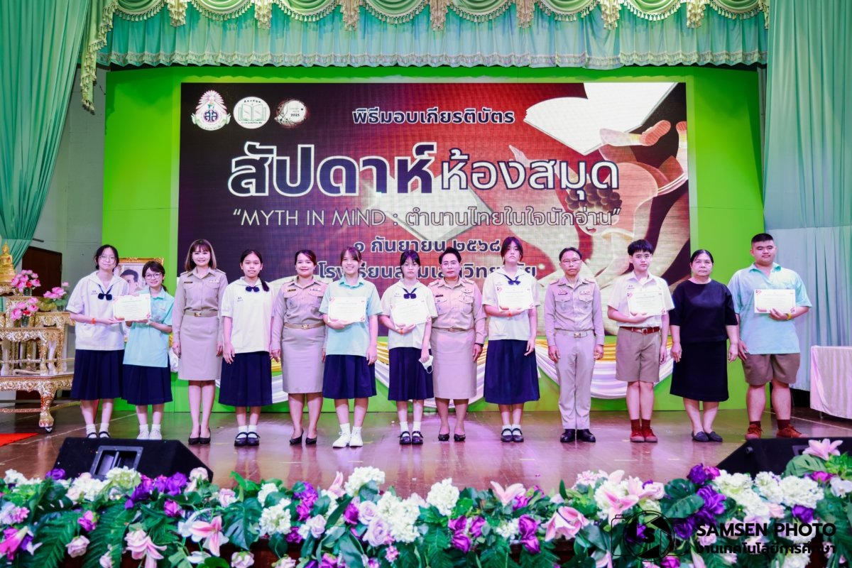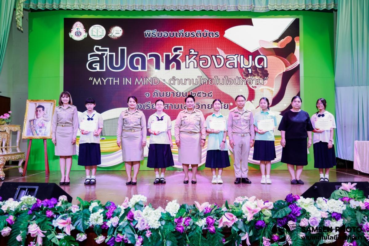 งานพัฒนาแหล่งเรียนรู้ กลุ่มบริหารวิชาการ จัดพิธีมอบเกียรติบัตรแก่นักเรียนที่เข้าร่วมการแข่งขันกิจกรรมสัปดาห์ห้องสมุด “Myth in Mind : ตำนานไทยในใจนักอ่าน” ปีการศึกษา 2568 ประกอบด้วยกิจกรรมที่คั่นหนังสื่อสื่อความรู้ กิจกรรมสรุปข่าวเล่าเรื่อง กิจกรรมออกแบบมาสคอตห้องสมุด กิจกรรมประกวดคอสเพลย์ กิจกรรมเล่าขานตำนานไทย กิจกรรมนักสืบค้นห้องสมุด และกิจกรรมหนังสือเล่มเล็ก โดย นางสาวจินต์จุฑา พรหมรักษ์ รองผู้อำนวยการโรงเรียนสามเสนวิทยาลัย พร้อมด้วยคณะผู้บริหารและครูร่วมมอบรางวัลแก่นักเรียน ณ หอประชุมอาคารอาคารอเนกประสงค์ ในวันจันทร์ที่ 1 กันยายน พ.ศ. 2568 เวลา 07.40 น.