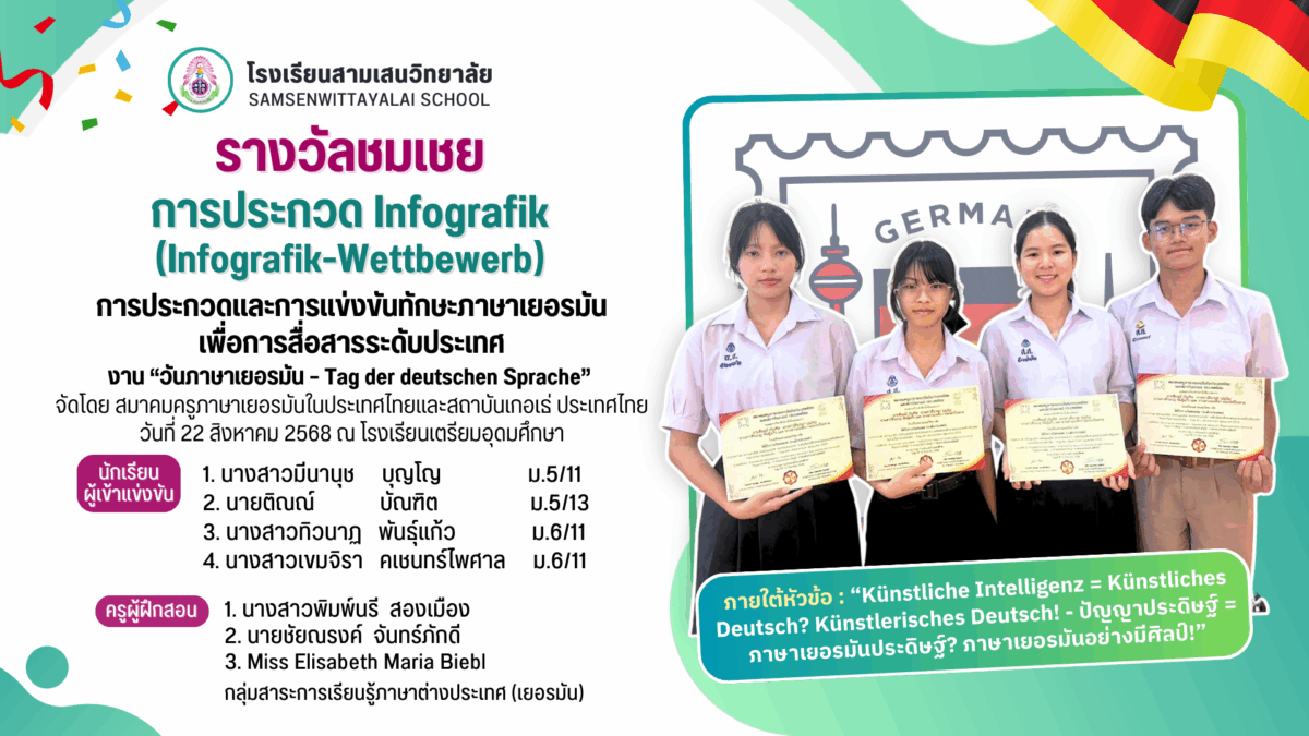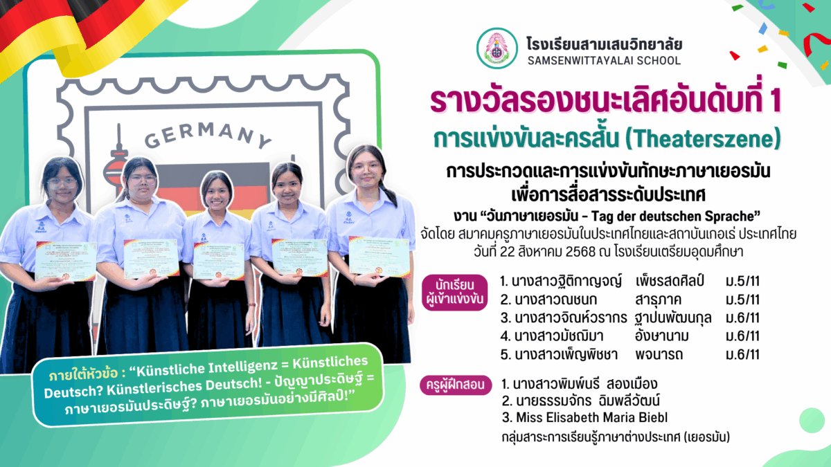 โรงเรียนสามเสนวิทยาลัย 🩷💚🎉🎉 ขอแสดงความยินดีกับลูกสามเสนฯ 🎊 กลุ่มการเรียนภาษาเยอรมัน ได้เข้าร่วมกิจกรรมการประกวดและการแข่งขันทักษะภาษาเยอรมันเพื่อการสื่อสารระดับประเทศ ในงาน “วันภาษาเยอรมัน – Tag der deutschen Sprache” ภายใต้หัวข้อ : “Künstliche Intelligenz = Künstliches Deutsch? Künstlerisches Deutsch! – ปัญญาประดิษฐ์ = ภาษาเยอรมันประดิษฐ์? ภาษาเยอรมันอย่างมีศิลป์!”