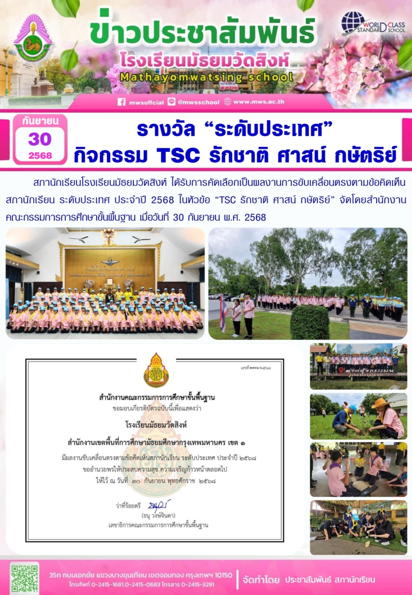สภานักเรียนโรงเรียนมัธยมวัดสิงห์ ได้รับการคัดเลือกเป็นผลงานการขับเคลื่อนตรงตามข้อคิดเห็นสภานักเรียน ระดับประเทศ ประจำปี 2568 ในหัวข้อ “TSC รักชาติ ศาสน์ กษัตริย์” จัดโดยสำนักงานคณะกรรมการการศึกษาขั้นพื้นฐาน เมื่อวันที่ 30 กันยายน พ.ศ. 2568