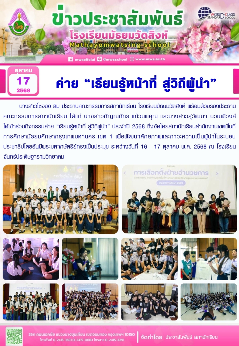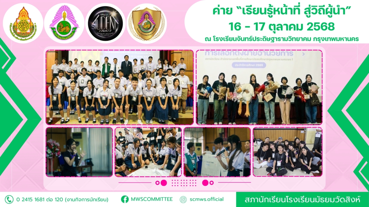 นางสาวโซจอง ลิม ประธานคณะกรรมการสภานักเรียน โรงเรียนมัธยมวัดสิงห์ พร้อมด้วยรองประธานคณะกรรมการสภานักเรียน ได้แก่ นางสาวกัญณภัทร แก้วนพคุณ และนางสาวสุวัฒนา นวเนติวงศ์ ได้เข้าร่วมกิจกรรมค่าย “เรียนรู้หน้าที่ สู่วิถีผู้นำ” ประจำปี 2568 ซึ่งจัดโดยสภานักเรียนสำนักงานเขตพื้นที่การศึกษามัธยมศึกษากรุงเทพมหานคร เขต 1 เพื่อพัฒนาศักยภาพและภาวะความเป็นผู้นำในระบอบประชาธิปไตยอันมีพระมหากษัตริย์ทรงเป็นประมุข ระหว่างวันที่ 16 – 17 ตุลาคม พ.ศ. 2568 ณ โรงเรียนจันทร์ประดิษฐารามวิทยาคม