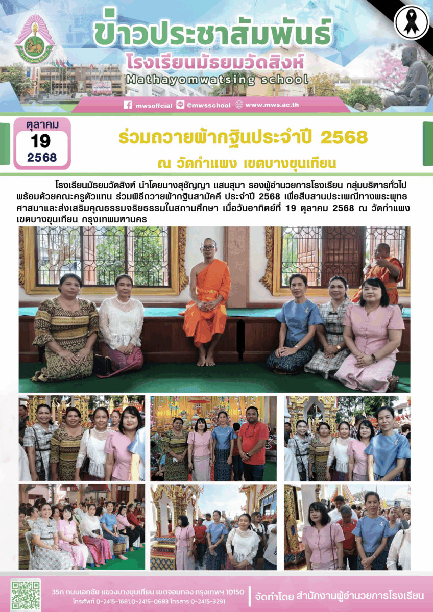 โรงเรียนมัธยมวัดสิงห์ นำโดยนางสุชัญญา แสนสุมา รองผู้อำนวยการโรงเรียน กลุ่มบริหารทั่วไป พร้อมด้วยคณะครูตัวแทน ร่วมพิธีถวายผ้ากฐินสามัคคี ประจำปี 2568 เพื่อสืบสานประเพณีทางพระพุทธศาสนาและส่งเสริมคุณธรรมจริยธรรมในสถานศึกษา เมื่อวันอาทิตย์ที่ 19 ตุลาคม 2568 ณ วัดกำแพง เขตบางขุนเทียน กรุงเทพมหานคร
