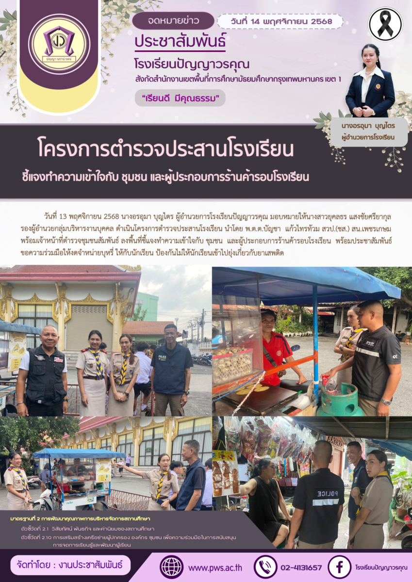 นางอรอุมา บุญไตร ผู้อำนวยการโรงเรียนปัญญาวรคุณ มอบหมายให้นางสาวยุคลธร แลงชัยศรียากุล รองผู้อำนวยกลุ่มบริหารงานบุคคล ดำเนินโครงการตำรวจประสานโรงเรียน นำโดย พ.ต.ต.บัญชา แก้วไทรท้วม สวป.(ซล.) สน.เพชรเกษม พร้อมเจ้าหน้าที่ตำรวจชุมชนสัมพันธ์ ลงพื้นที่ชี้แจงทำความเข้าใจกับ ชุมชน และผู้ประกอบการร้านค้ารอบโรงเรียน พร้อมประชาสัมพันธ์ ขอความร่วมมือให้งดจำหน่ายบุหรี่ ให้กับนักเรียน ป้องกันไม่ให้นักเรียนเข้าไปยุ่งเกี่ยวกับยาเสพติด