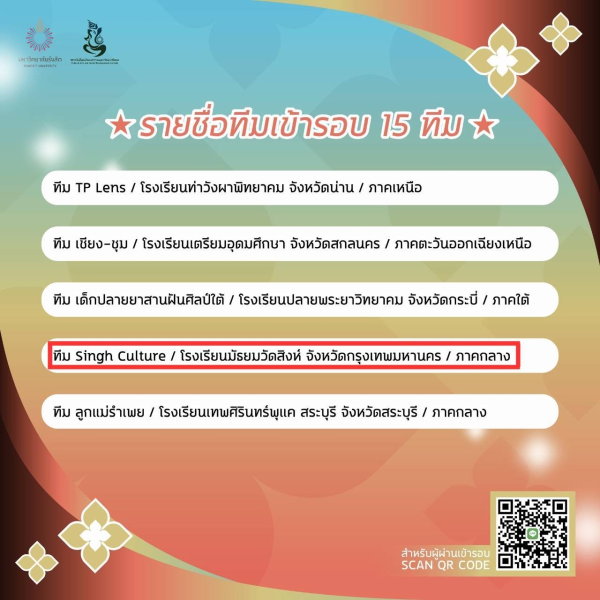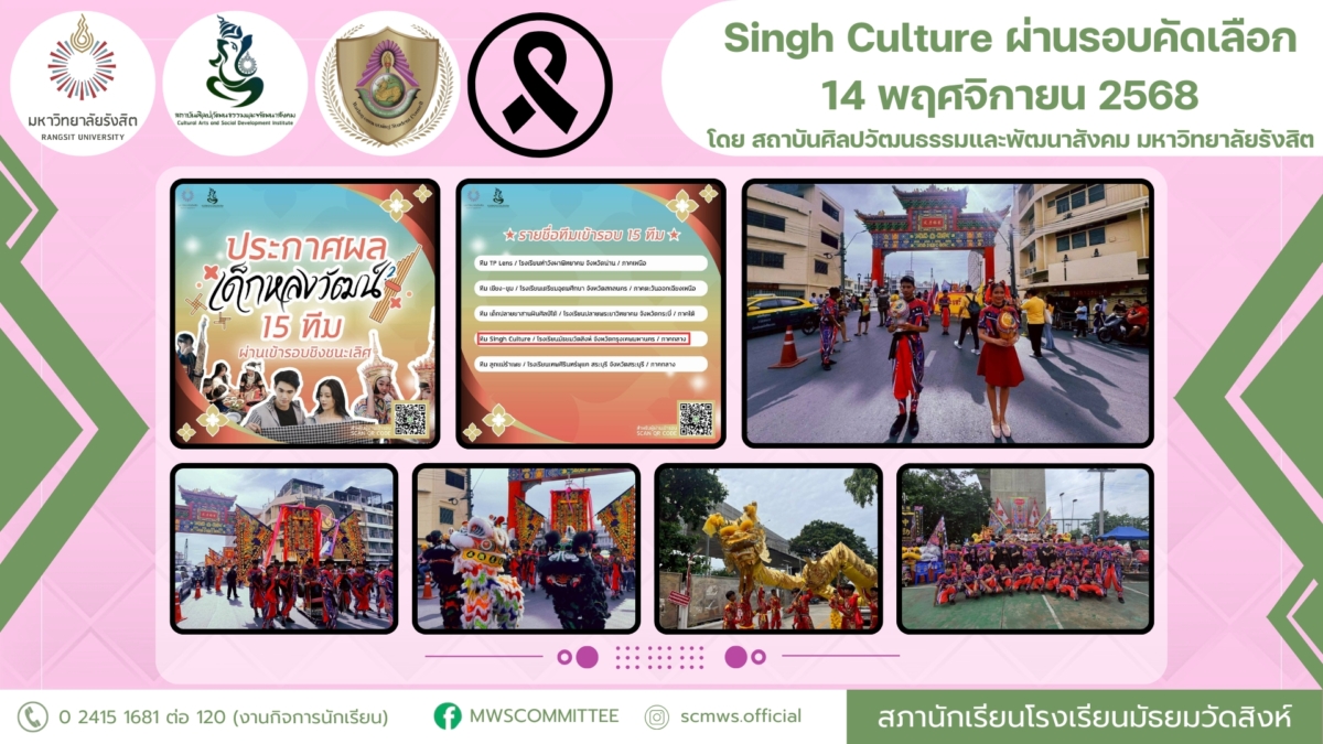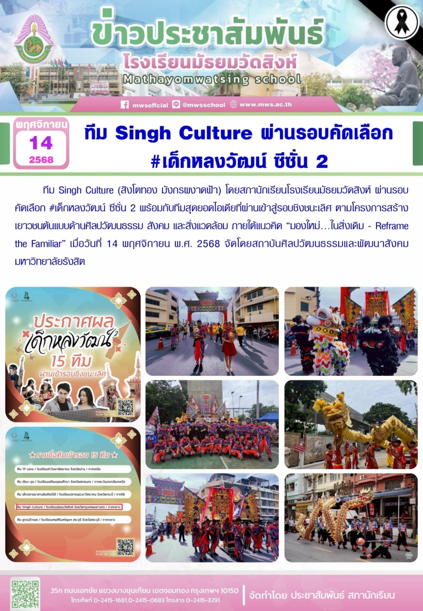 ทีม Singh Culture (สิงโตทอง มังกรผงาดฟ้า) โดยสภานักเรียนโรงเรียนมัธยมวัดสิงห์ ผ่านรอบคัดเลือก #เด็กหลงวัฒน์ ซีซั่น 2 พร้อมกับทีมสุดยอดไอเดีย ที่ผ่านเข้าสู่รอบชิงชนะเลิศ ตามโครงการสร้างเยาวชนต้นแบบด้านศิลปวัฒนธรรม สังคม และสิ่งแวดล้อม ภายใต้แนวคิด “มองใหม่…ในสิ่งเดิม – Reframe the Familiar” เมื่อวันที่ 14 พฤศจิกายน พ.ศ. 2568 จัดโดยสถาบันศิลปวัฒนธรรมและพัฒนาสังคม มหาวิทยาลัยรังสิต