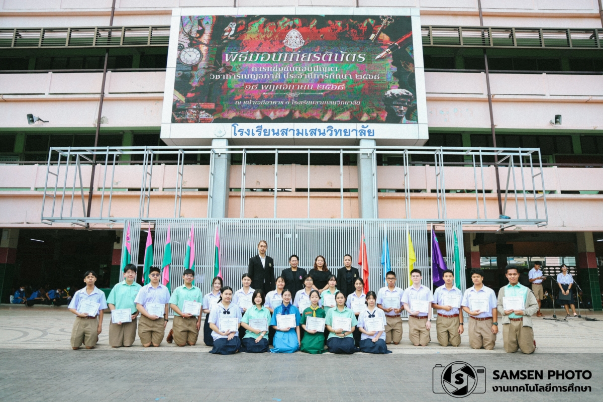 งานส่งเสริมประชาธิปไตยในโรงเรียน กลุ่มบริหารกิจการนักเรียน จัดพิธีมอบเกียรติบัตรแก่นักเรียนที่ได้รับรางวัลการแข่งขันตอบปัญหาวิชาการเบญจภาคี ประจำปีการศึกษา 2568 (Benjapakee 2025) ระดับชั้นมัธยมศึกษาตอนต้นและระดับชั้นมัธยมศึกษาตอนปลาย โดยนายประจวบ อินทรโชติ ผู้อำนวยการโรงเรียนสามเสนวิทยาลัย เป็นประธานในพิธีมอบเกียรติบัตรนางสาวจุฬาลักษณ์ ศรีเมือง นักเรียนชั้นมัธยมศึกษาปีที่ 5/17 รองประธานนักเรียนโรงเรียนสามเสนวิทยาลัย รุ่นที่ 71 (ฝ่ายวิชาการ) เป็นผู้กล่าวรายงานวัตถุประสงค์การจัดกิจกรรม พร้อมด้วยคณะครู และนักเรียนเข้าร่วมพิธี ณ เวทีอาคาร 3 โรงเรียนสามเสนวิทยาลัย ในวันอังคารที่ 18 พฤศจิกายน พ.ศ. 2568