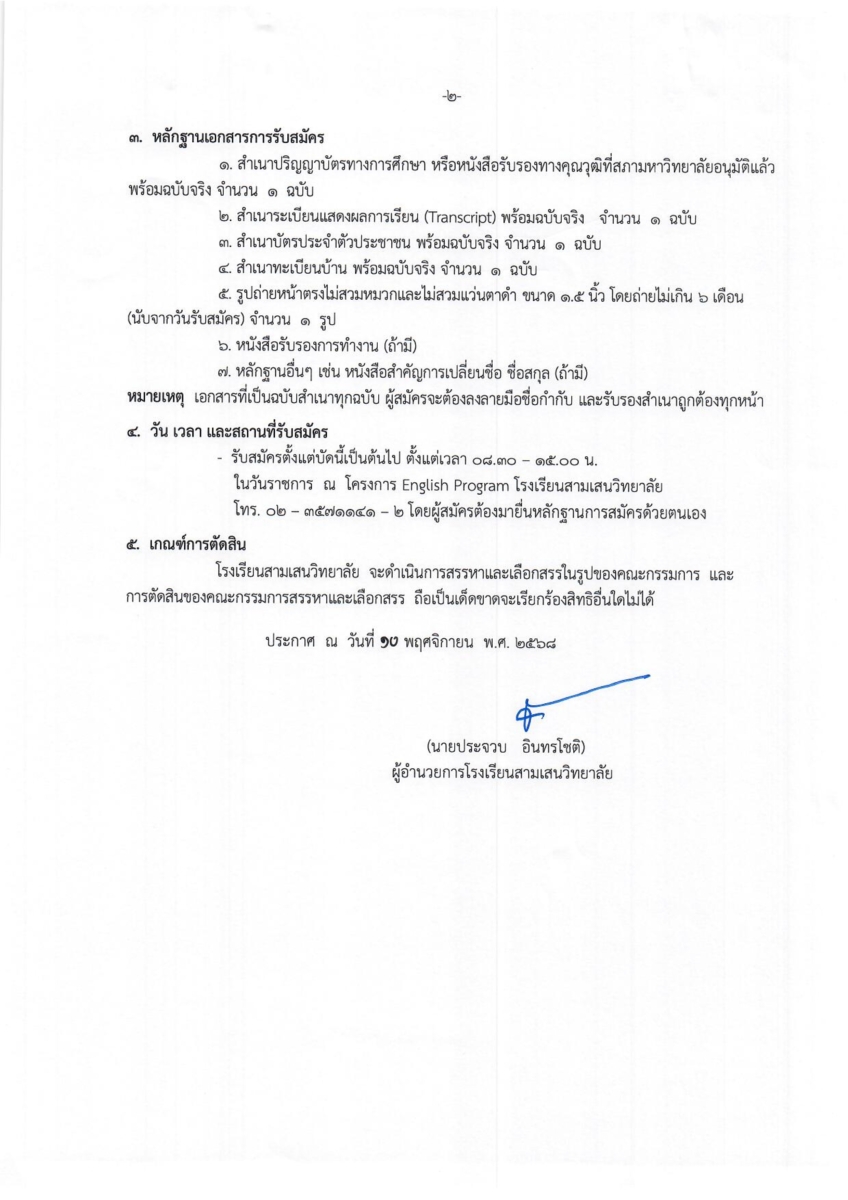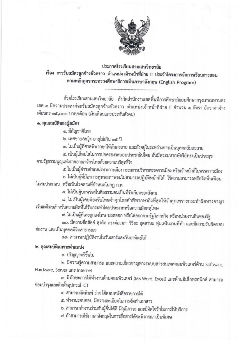 โรงเรียนสามเสนวิทยาลัย รับสมัครลูกจ้างชั่วคราว ตำแหน่ง เจ้าหน้าที่ฝ่าย IT ประจำโครงการจัดการเรียนการสอนตามหลักสูตรกระทรวงศึกษาธิการเป็นภาษาอังกฤษ (English Program)